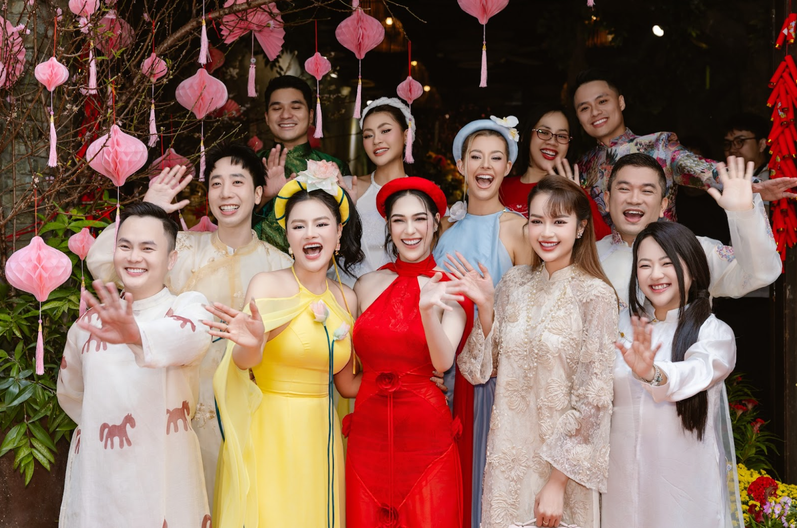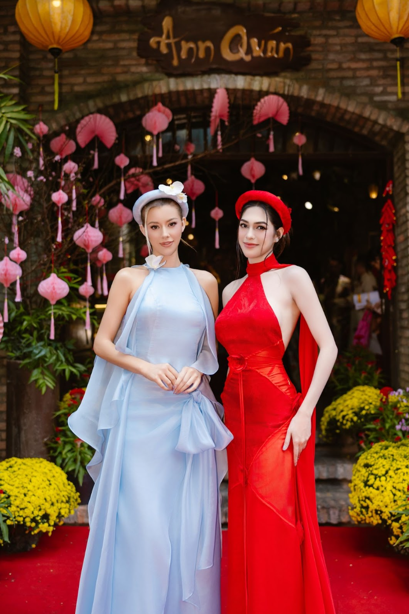 Bên cạnh đó, ba nàng hậu Khánh Vân, Xuân Hạnh và Phương Linh cùng xuất hiện trong trang phục áo tứ thân Bắc Bộ với bảng màu rực rỡ, gợi nhắc không khí lễ hội xuân truyền thống. Sự đồng điệu trong lựa chọn trang phục của các người đẹp thu hút sự chú ý của đông đảo thực khách, góp phần tạo nên bức tranh Tết vừa trang trọng vừa gần gũi.
