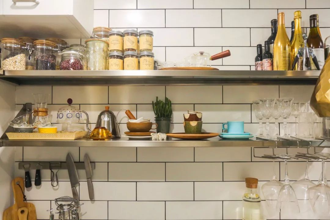 Tường bếp được ốp gạch vuông trắng, thay vì dùng tủ bếp kín, Huang lựa chọn các kệ inox mở. Những bộ bát đĩa, dụng cụ nấu ăn nhiều màu sắc vừa tiện sử dụng, vừa trở thành điểm nhấn trang trí cho căn bếp nhỏ.