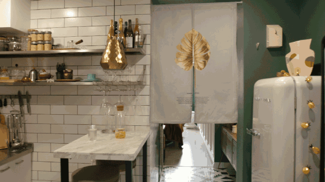 Trên lối đi dẫn vào phòng ngủ, Huang sử dụng rèm vải mềm mại. Khi kéo rèm, màu xanh của bức tường phía trong tạo cảm giác không gian được kéo dài, tránh sự bí bách thường thấy ở nhà diện tích nhỏ.