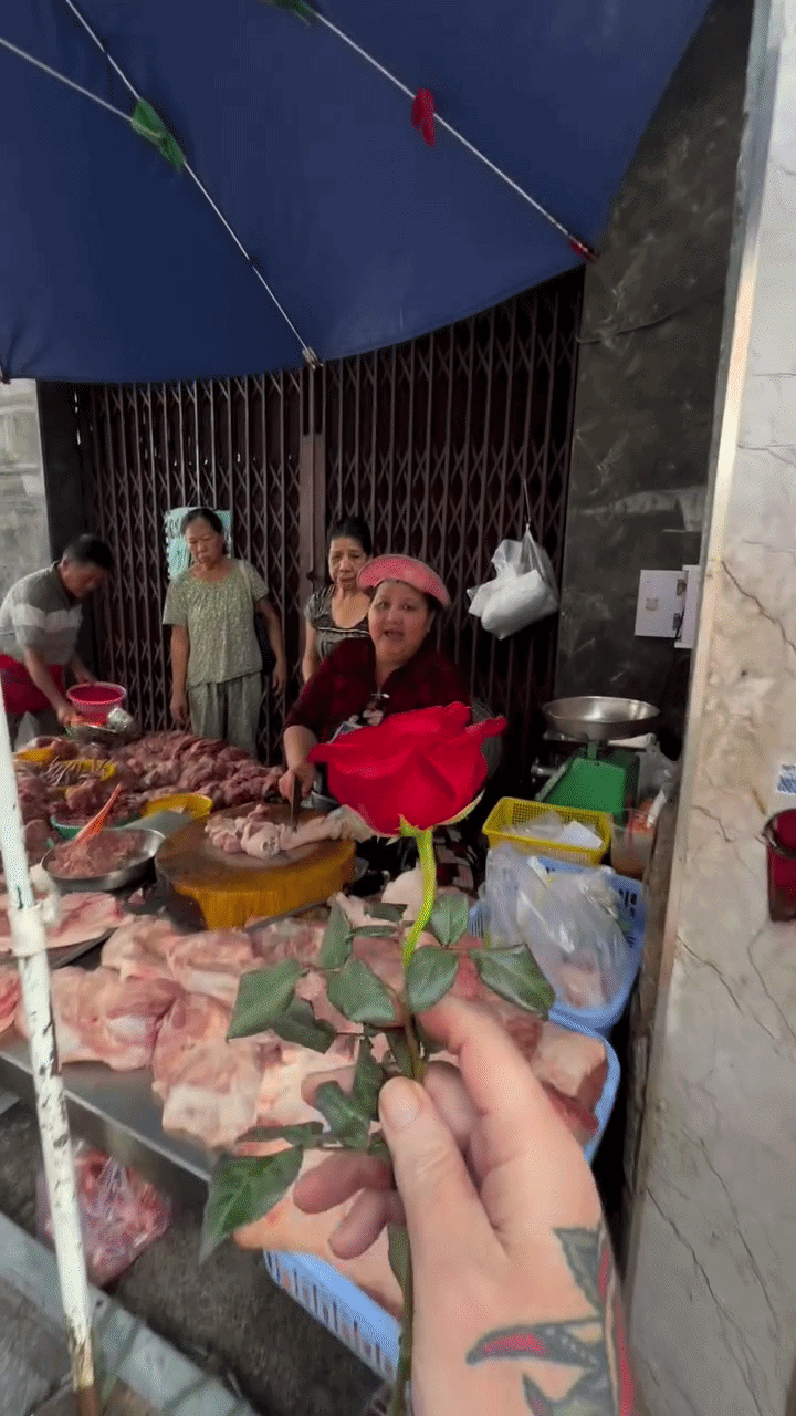 Trong không khí rộn ràng của ngày Quốc tế Phụ nữ, anh chàng du khách với phong cách cực kỳ trẻ trung đã mang một bông hồng đỏ thắm đến sạp thịt heo quen thuộc. Không cần những nhà hàng sang trọng hay ánh nến lung linh, món quà được trao đi ngay trên chiếc thớt gỗ, giữa tiếng dao thớt bận rộn của buổi chợ sớm.