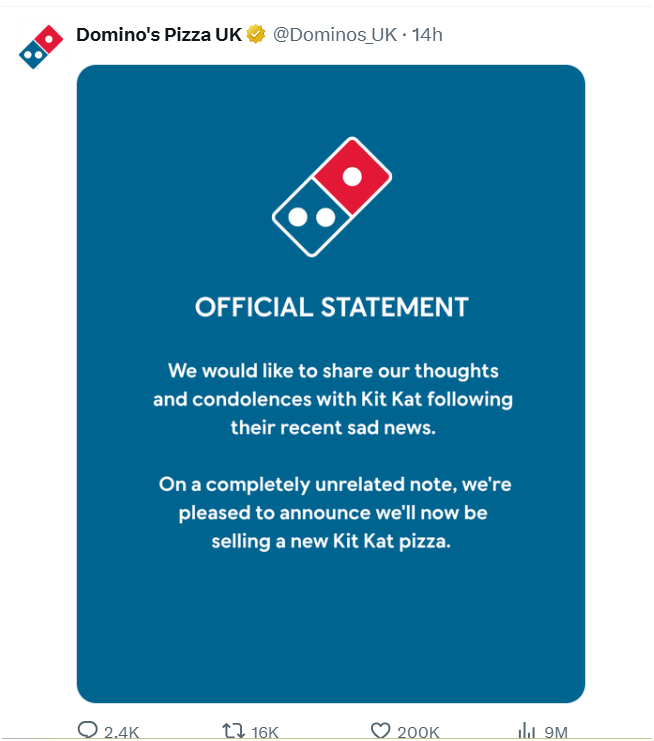 "Chúng tôi muốn chia sẻ suy nghĩ và lời chia buồn với KitKat sau tin buồn gần đây của họ. Về một vấn đề hoàn toàn không liên quan, chúng tôi rất vui mừng thông báo rằng chúng tôi sẽ bắt đầu bán món pizza KitKat mới", bài đăng bắt trend của Domino’s Pizza UK,