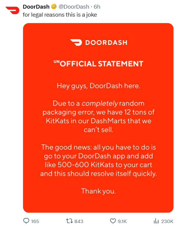 Ở thị trường quốc tế, các brand lớn cũng không chịu thua. DoorDash (ứng dụng giao đồ ăn nổi tiếng của Mỹ) đăng “unofficial statement” vui nhộn với nội dung do lỗi đóng gói ngẫu nhiên, họ đang có sẵn 12 tấn KitKat không bán được và kêu gọi mọi người vào app đặt ngay 500-600 thanh để “giải quyết vấn đề”.