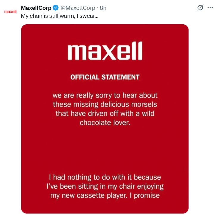 "Chúng tôi thực sự rất tiếc khi nghe về những món ngon đang mất tích này, thứ đã khiến một người yêu chocolate cuồng nhiệt lái xe bỏ chạy. Tôi hoàn toàn không liên quan gì đến chuyện này vì tôi vẫn đang ngồi trên ghế của mình, thưởng thức chiếc máy nghe nhạc cassette mới. Tôi hứa đấy", Maxell viết.