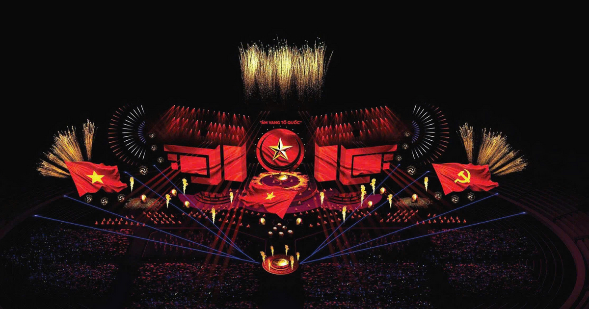 Toàn cảnh sân khấu tại sân vận động quốc gia Mỹ Đình - nơi diễn ra chương trình nghệ thuật chính luận đặc biệt “Âm vang Tổ quốc”. Ảnh: Ban tổ chức