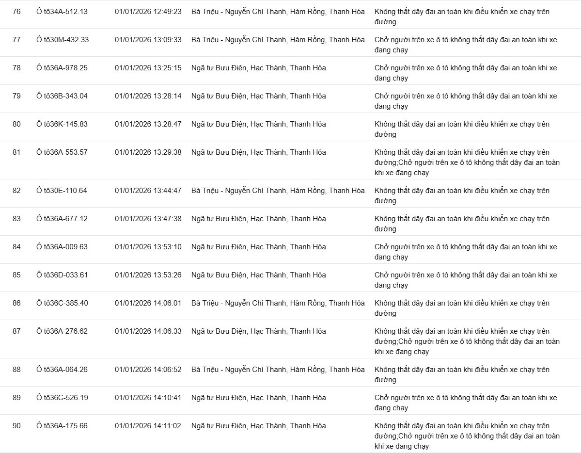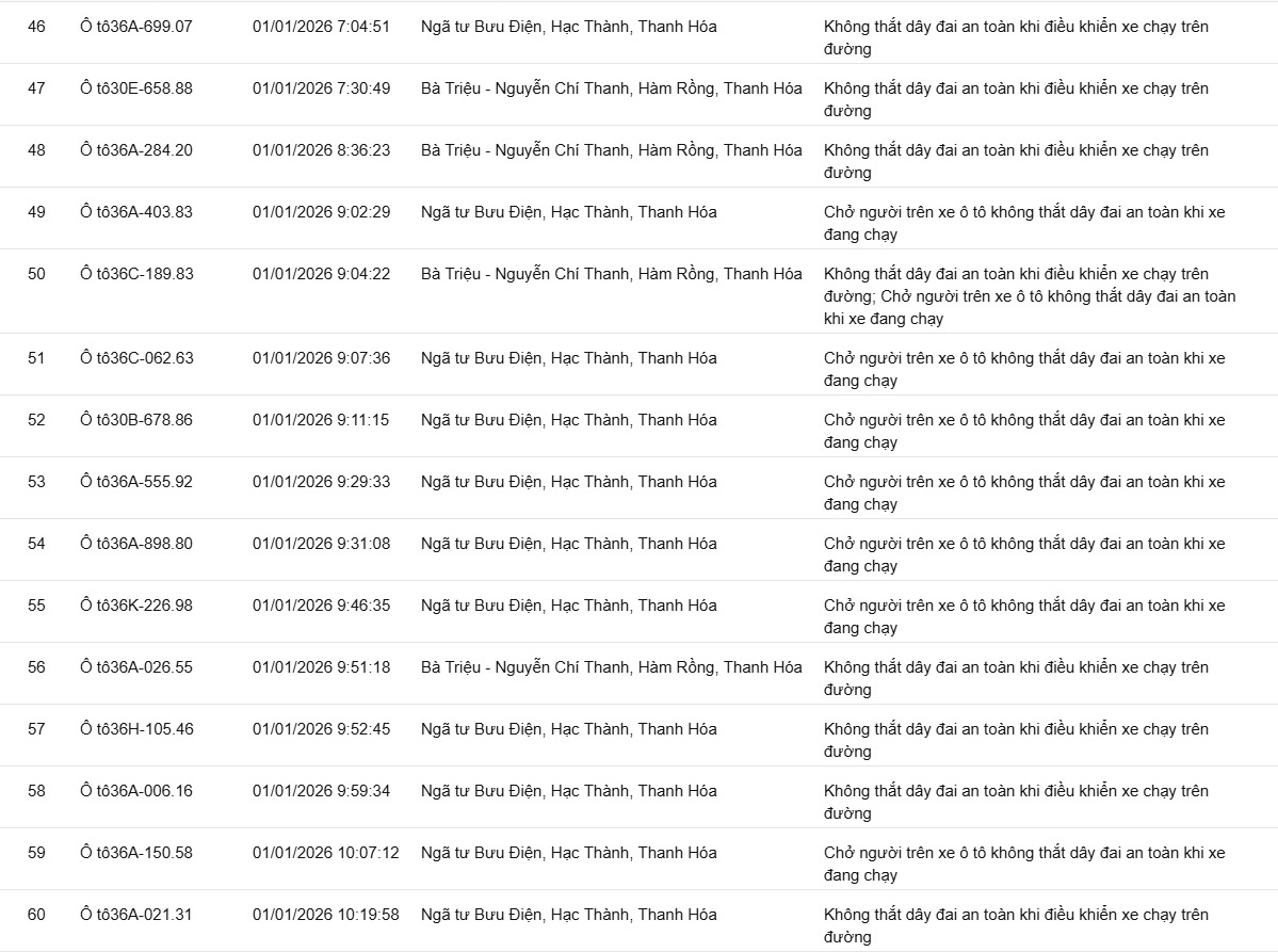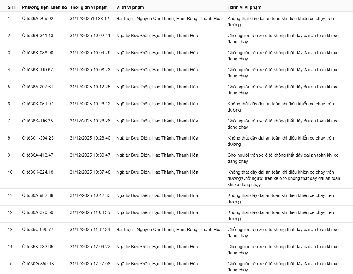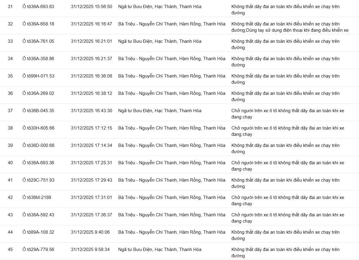 Phòng CSGT tỉnh Thanh Hóa đã xác định thêm nhiều trường hợp vi phạm bị phạt nguội từ ngày 31/12/2025 đến ngày 02/1/2026.