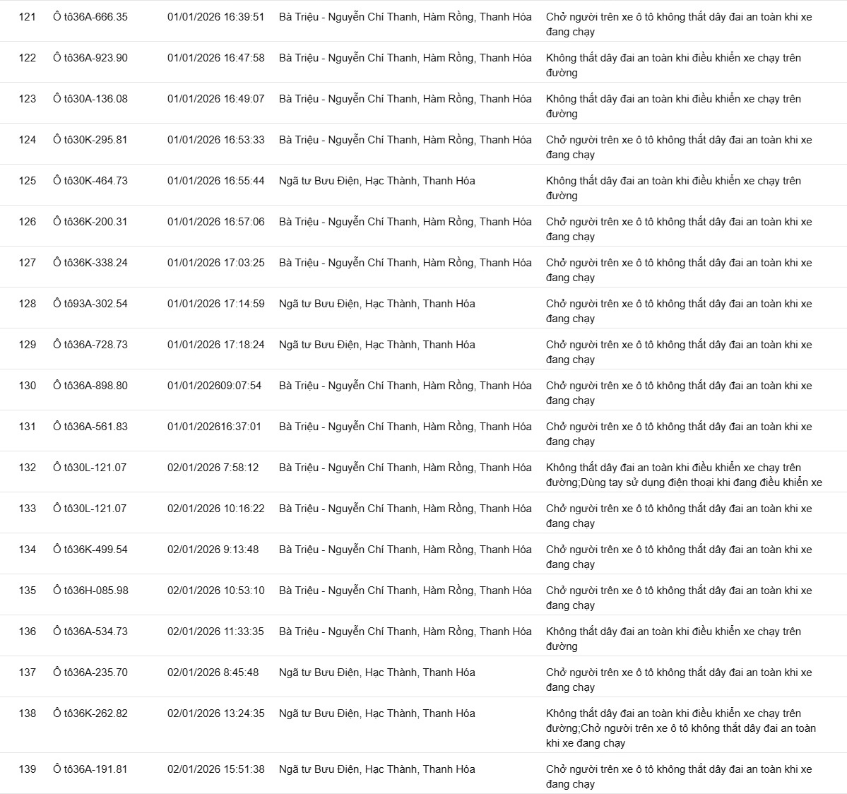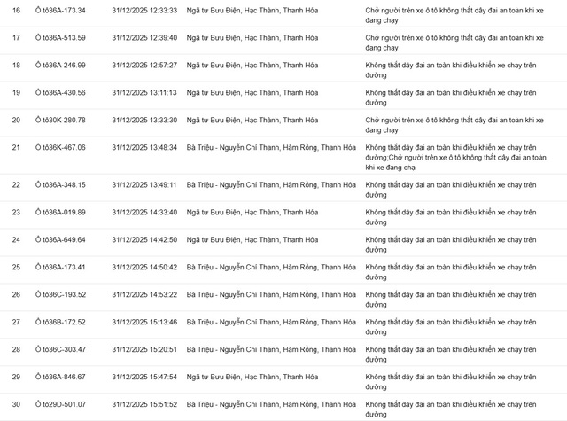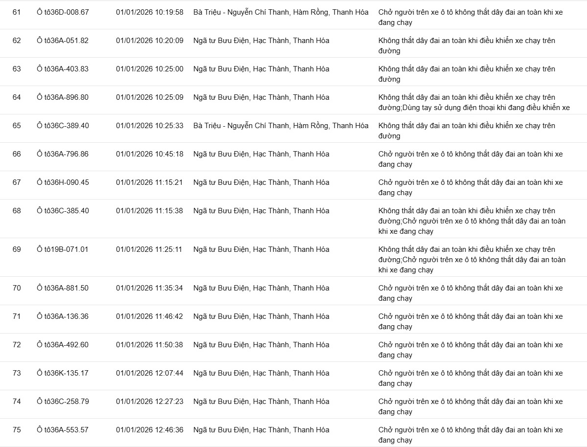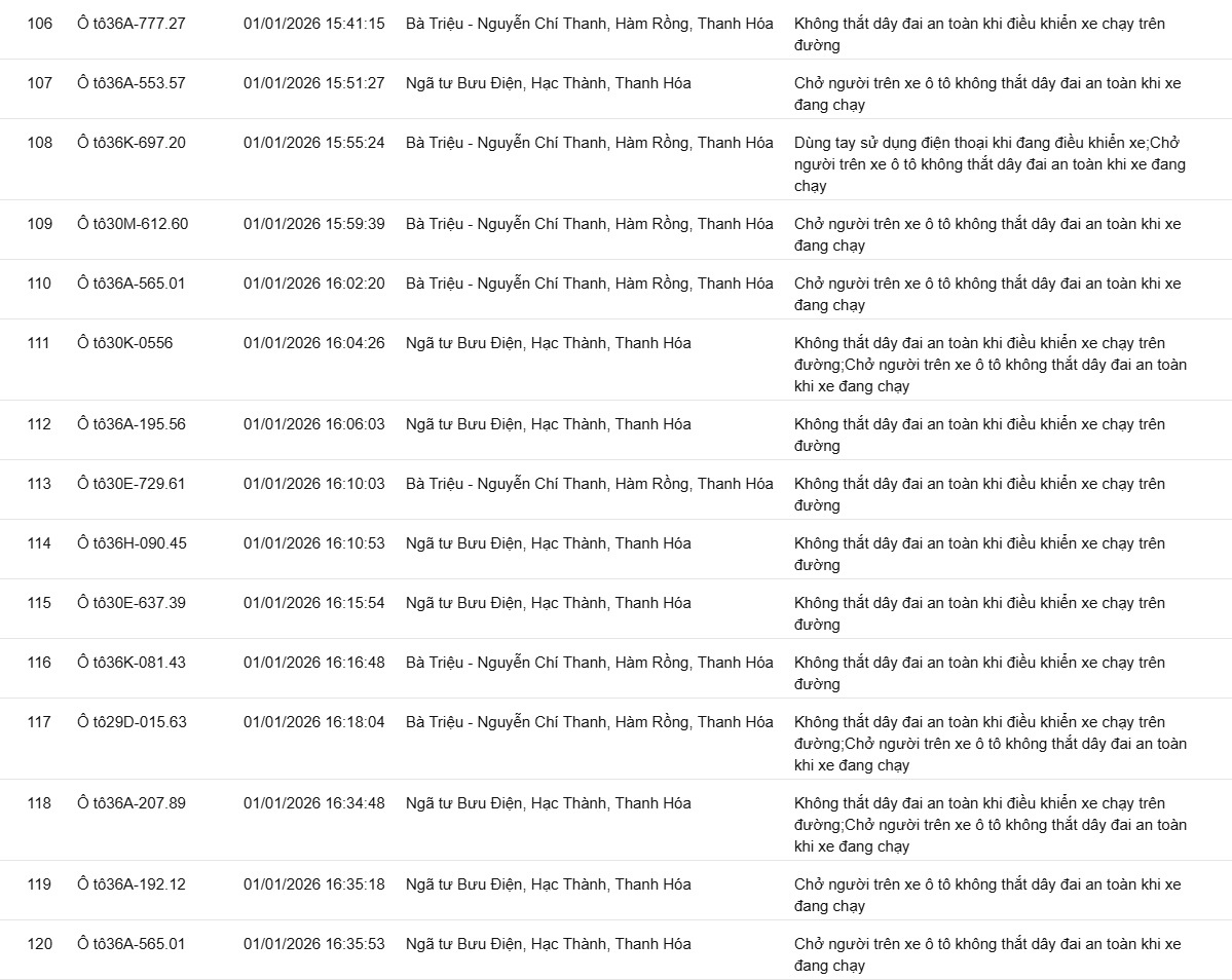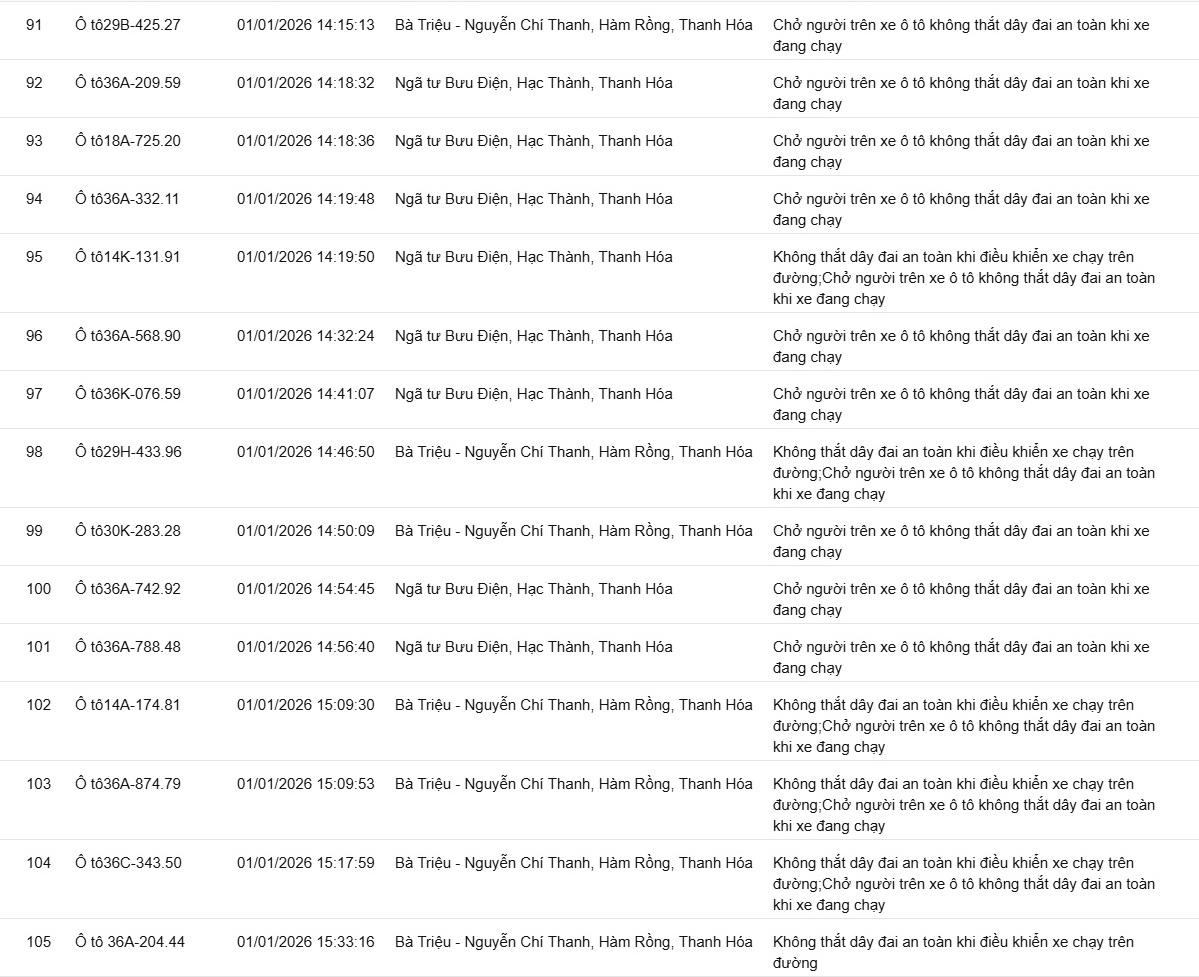 Phòng CSGT tỉnh Thanh Hóa đã xác định thêm nhiều trường hợp vi phạm bị phạt nguội từ ngày 31/12/2025 đến ngày 02/1/2026.