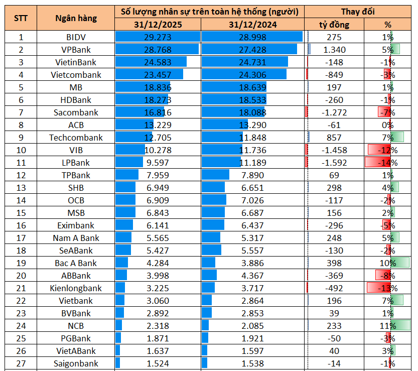 Trong đó, có tổng cộng 14 ngân hàng giảm quy mô nhân sự trong năm 2025 và 13 ngân hàng mở rộng.