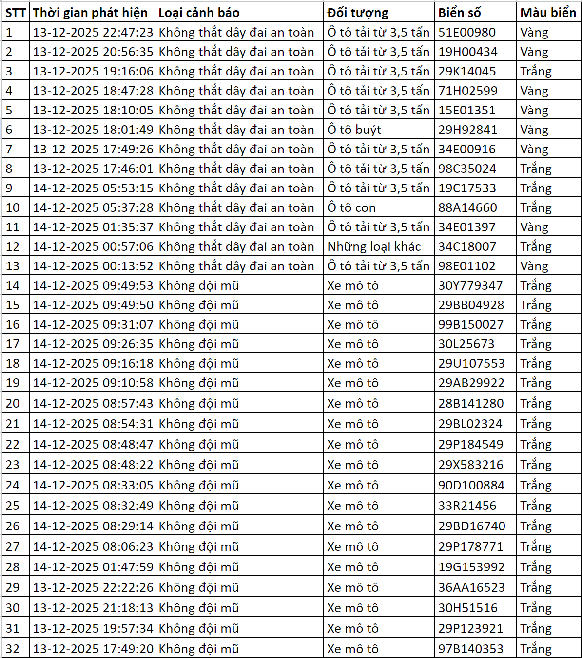 Cục Cảnh sát giao thông thông báo, từ 12h00’ ngày 13/12/2025 đến 12h00’ ngày 14/12/2025, camera A.I tại km 20 tuyến cao tốc Nội Bài - Lào Cai ghi nhận có 14.231 phương tiện đi qua với tốc độ trung bình là 72 km/h. Đồng thời phát hiện: 13 trường hợp không thắt dây đai an toàn. Các trường hợp vi phạm này đều được thông tin tới chủ phương tiện để xử lý theo quy định.