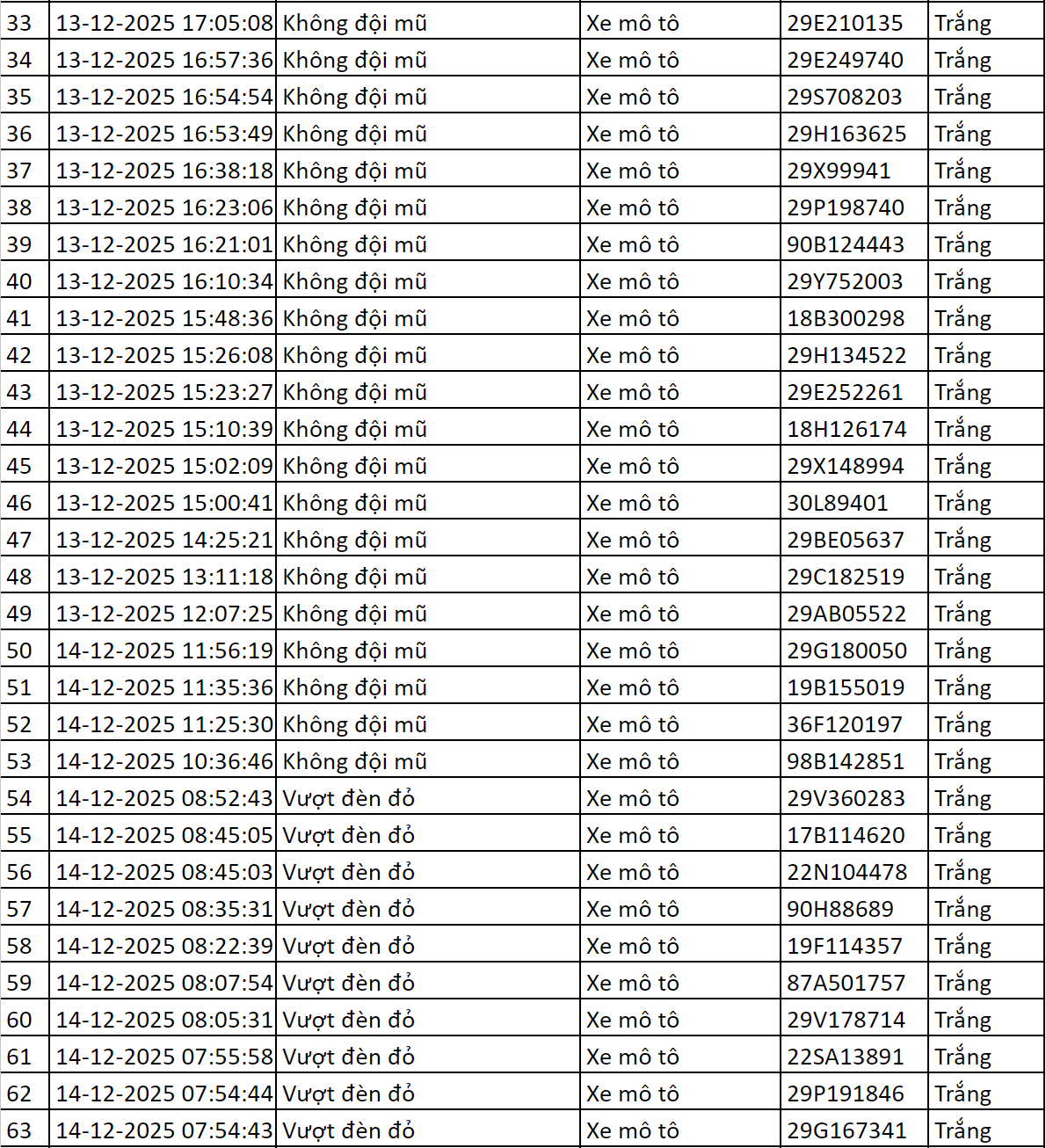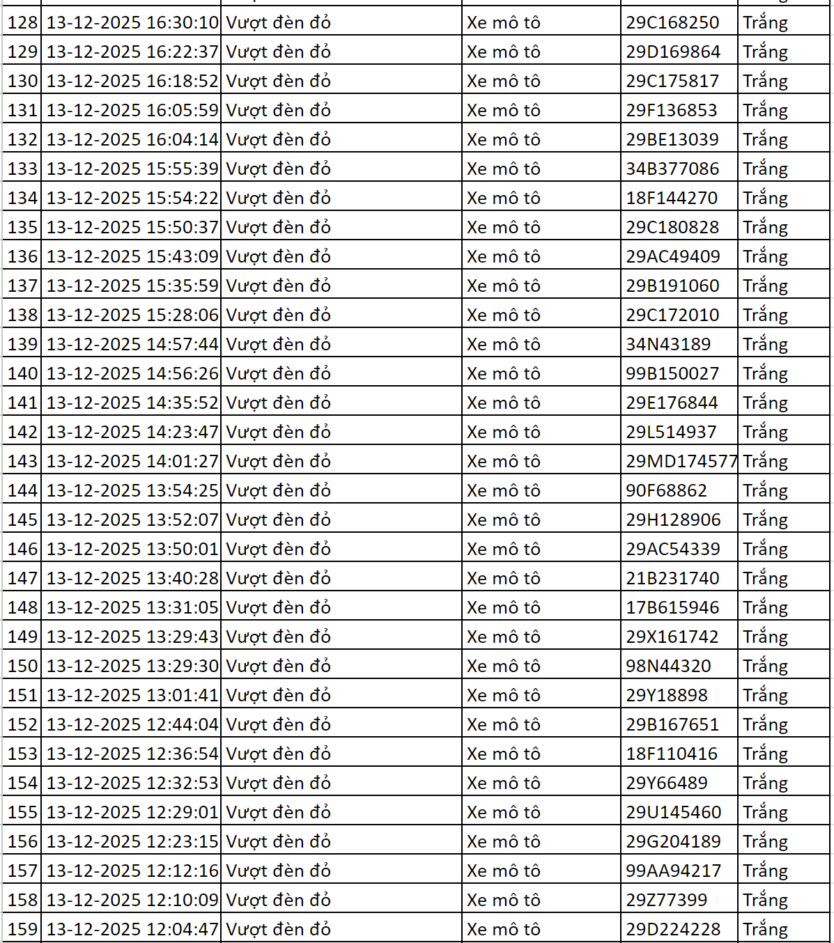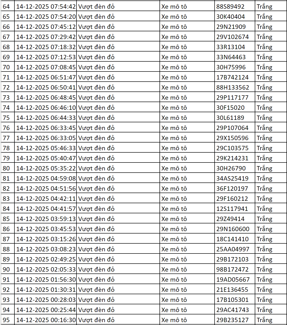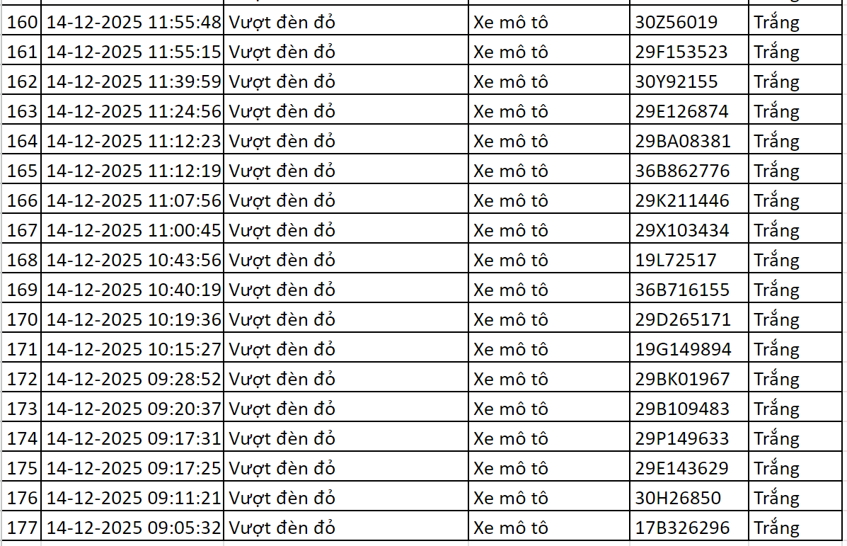 Chỉ trong ngày 14/12/2025, Cục Cảnh sát giao thông đã xác định thêm nhiều trường hợp vi phạm trật tự an toàn giao thông qua hệ thống camera A.I.