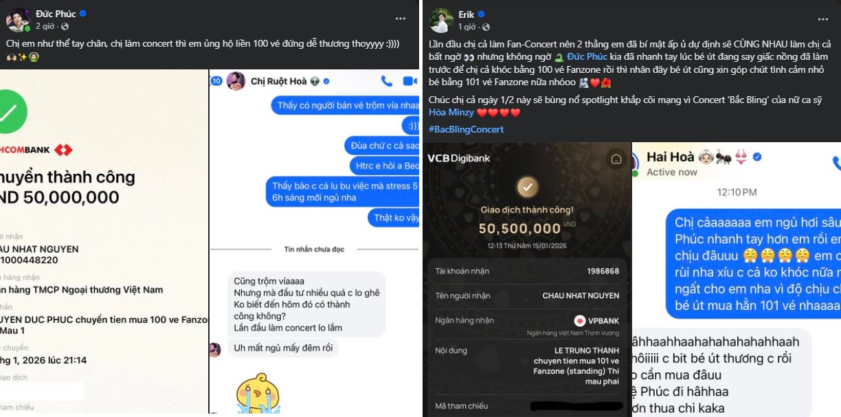 Sáng nay, 2 ca sĩ Erik và Đức Phúc đã khiến cộng đồng người hâm mộ chú ý khi cùng nhau chuyển khoản tổng cộng 100.500.000 đồng để mua 200 vé Fanzone ở fan concert Bắc Bling của ca sĩ Hòa Minzy. Toàn bộ sự việc được hai nam ca sĩ chia sẻ công khai trên trang cá nhân, kèm hình ảnh chuyển khoản và những dòng trạng thái đầy tình cảm.