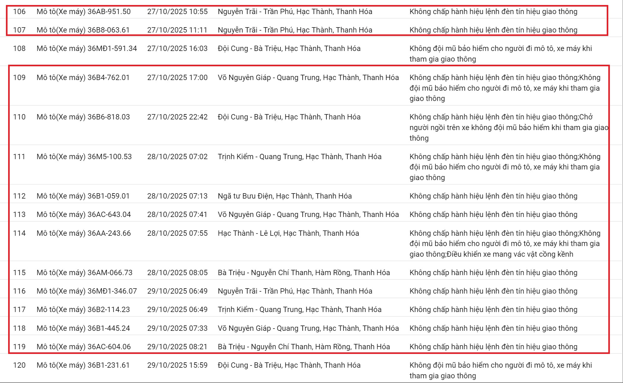 Công an tỉnh Thanh Hóa cũng thông báo, từ ngày 20/10/2025 đến ngày 31/10/2025, Phòng Cảnh sát giao thông ghi nhận 121 trường hợp ô tô và xe máy vi phạm lỗi “Không chấp hành hiệu lệnh của đèn tín hiệu giao thông”. Danh sách cụ thể như sau: