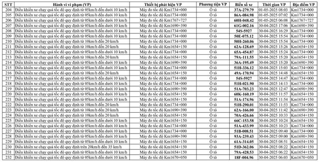 Theo thông báo từ Phòng Cảnh sát giao thông (CSGT) Công an tỉnh Bình Thuận, từ ngày 30/4/2025 đến ngày 14/5/2025, thông qua hệ thống giám sát - xử lý vi phạm trật tự, an toàn giao thông trên tuyến Quốc lộ 1A đã phát hiện có 232 phương tiện vi phạm về TTATGT đường bộ. Trong thời hạn 10 ngày kể từ ngày vi phạm, Phòng CSGT gửi thông báo đến chủ phương tiện vi phạm, tổ chức, cá nhân có liên quan đến vi phạm hành chính được biết và phối hợp thực hiện giải quyết theo quy định.