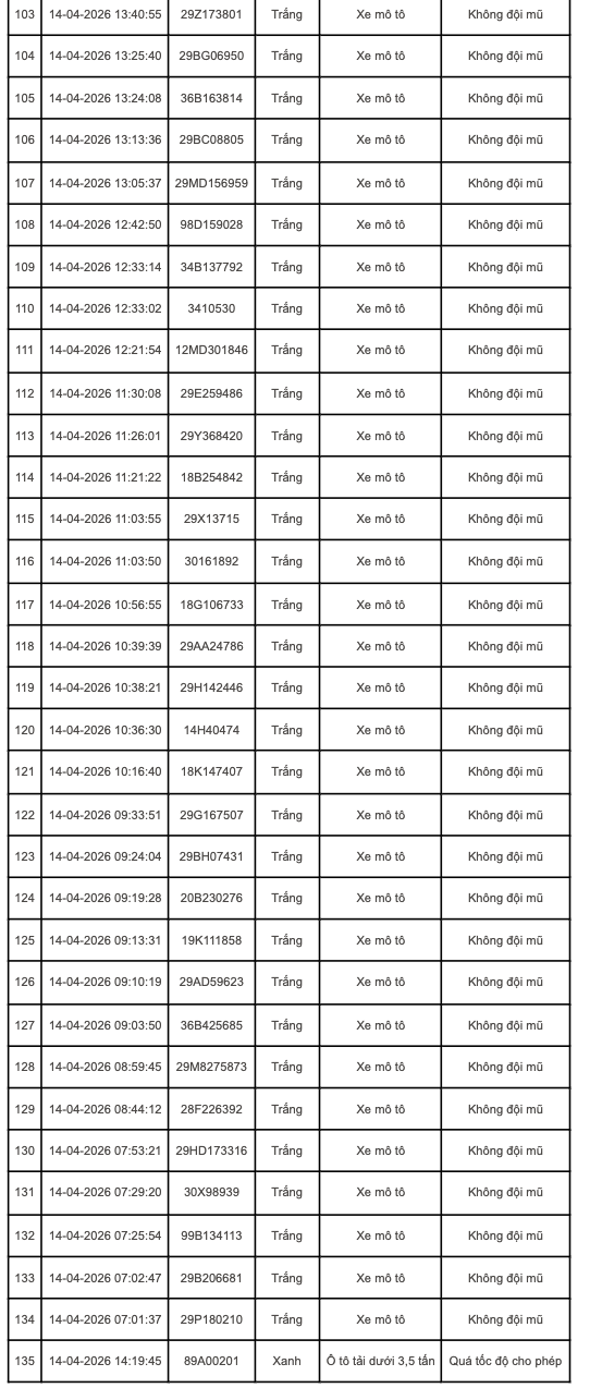 Theo thông tin từ Cục Cảnh sát giao thông (CSGT) - Bộ Công an, trong khoảng thời gian từ 7h30 ngày 14/4 đến 7h30 ngày 15/4/2026, hệ thống camera giám sát ứng dụng trí tuệ nhân tạo trên tuyến cao tốc Nội Bài - Lào Cai và các nút giao nội đô Hà Nội đã phát hiện 135 trường hợp vi phạm.