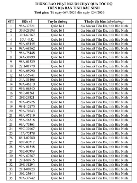 Bên cạnh đó, tại Bắc Ninh, Theo Công an tỉnh, trong khoảng thời gian từ ngày 6/4 đến 12/4, lực lượng chức năng đã ghi nhận nhiều trường hợp phương tiện vi phạm thông qua hệ thống giám sát. Trong đó, lỗi chạy quá tốc độ chiếm tỷ lệ đáng kể.