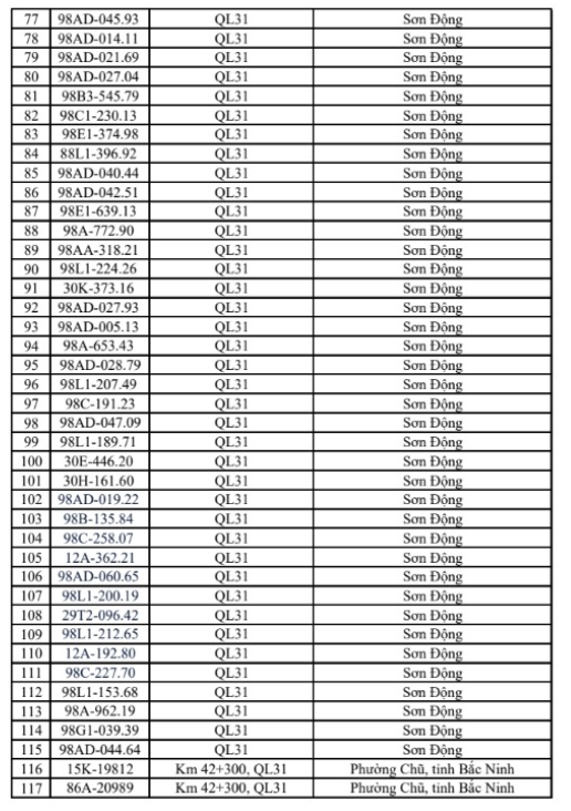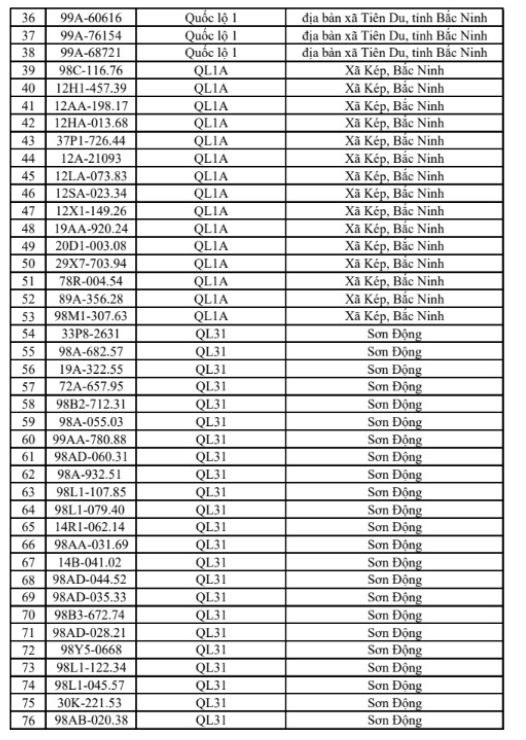 Danh sách các phương tiện vi phạm đã được công bố gồm:
