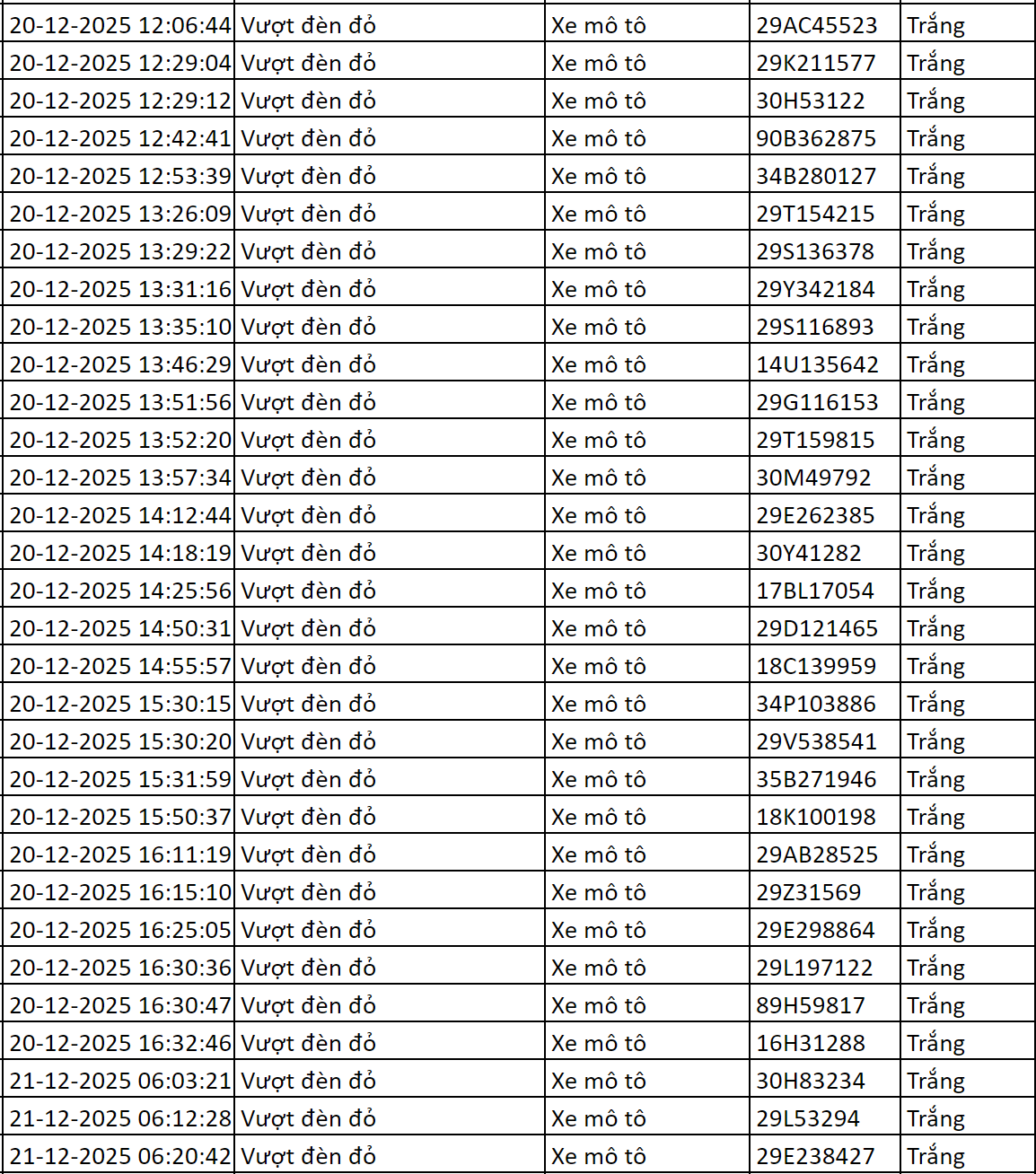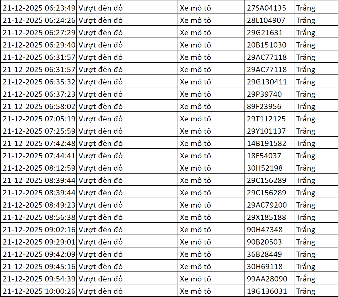 Từ 12h00’ ngày 20/12/2025 đến 12h00’ ngày 21/12/2025, qua trích xuất dữ liệu từ camera A.I được thí điểm lắp đặt tại nội đô Hà Nội (nút giao phố Phạm Văn Bạch - Hoàng Quán Chi), đã tự động phát hiện: 71 trường hợp không chấp hành hiệu lệnh của đèn tín hiệu - vượt đèn đỏ. Những trường hợp này đã được chuyển cho Công an Tp.Hà Nội và các đơn vị chức năng để thực hiện thủ tục xử lý vi phạm. Danh sách cụ thể như sau: