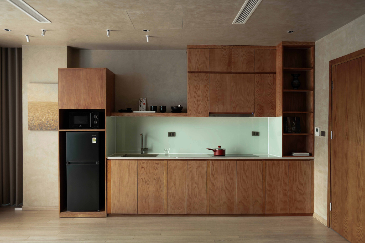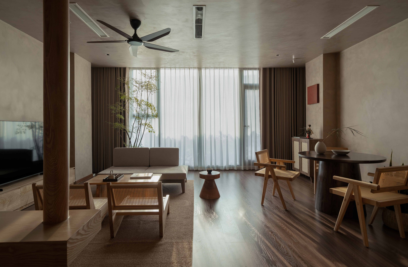 Cảm hứng Việt Nam : Không gian tầng 3 được lấy cảm hứng từ tinh thần nhà Việt truyền thống, nơi sự ấm cúng và gần gũi được đặt lên hàng đầu. Màu đất, gỗ tự nhiên và các chi tiết thủ công được xử lý nhẹ nhàng, tạo nên cảm giác thân thuộc mà không hoài cổ. Những vật liệu gợi nhớ văn hóa Bắc Bộ – gạch mộc, gỗ nâu, ánh sáng vàng ấm – được tiết chế vừa đủ, giúp căn hộ cân bằng giữa truyền thống và hiện đại.