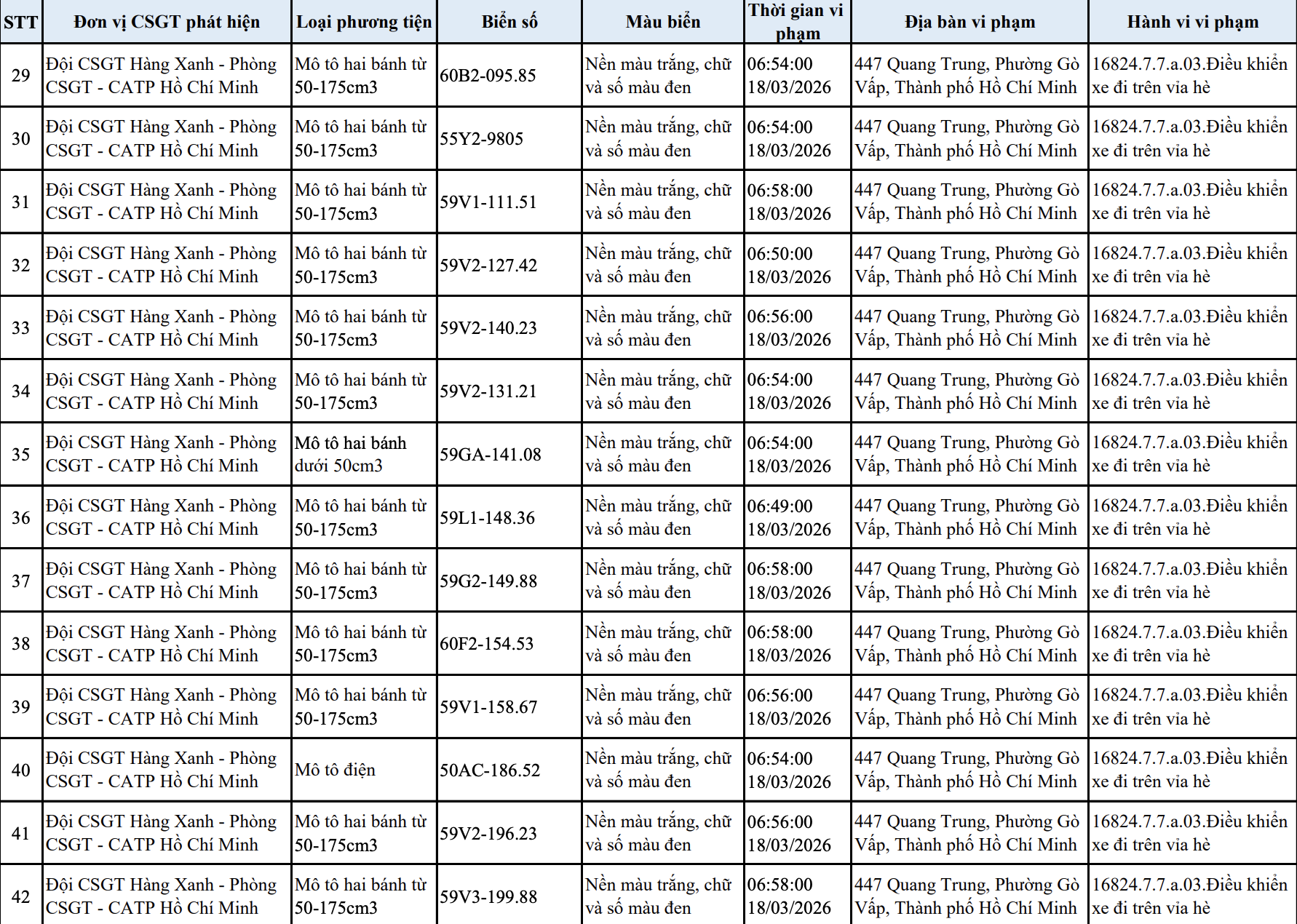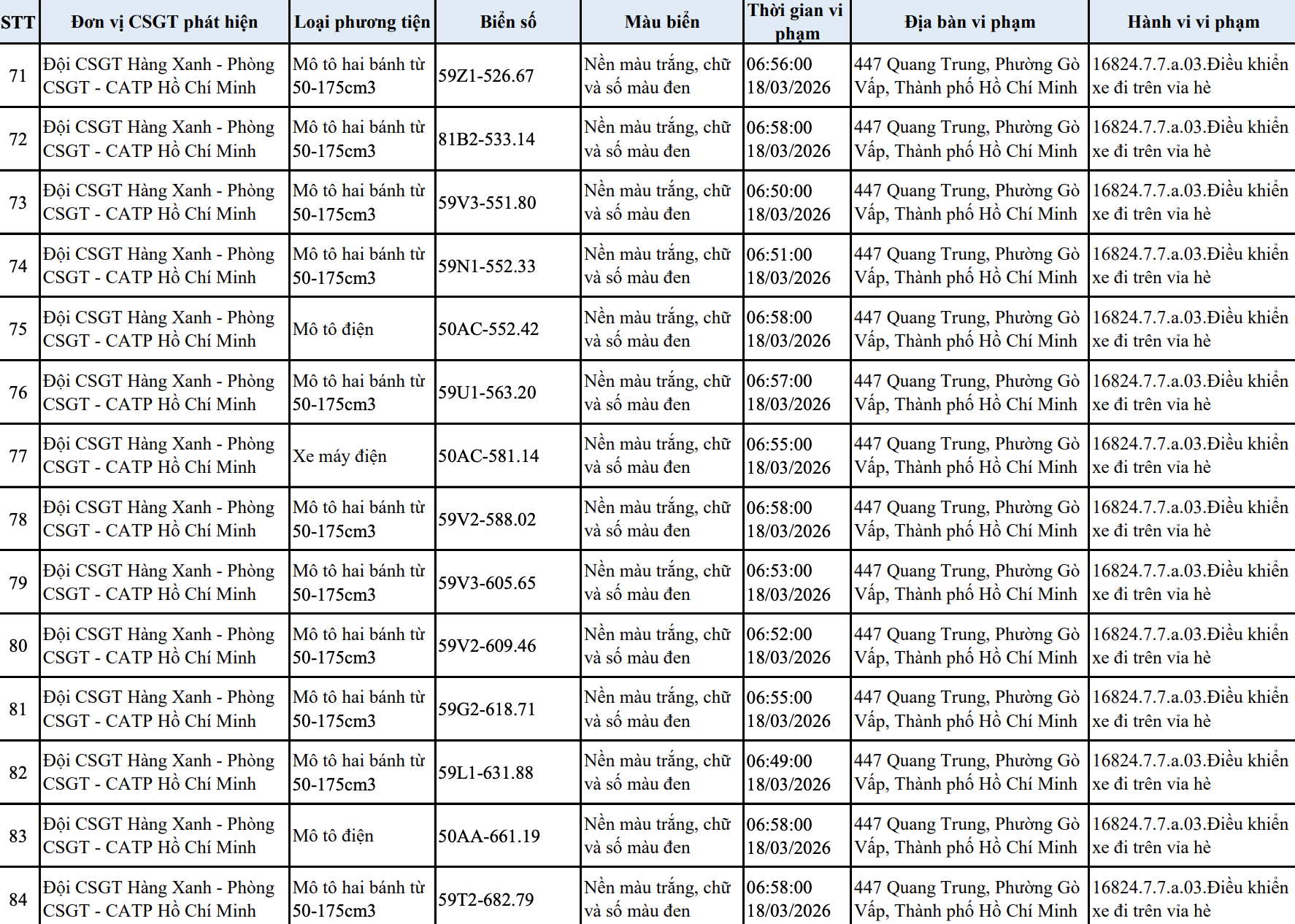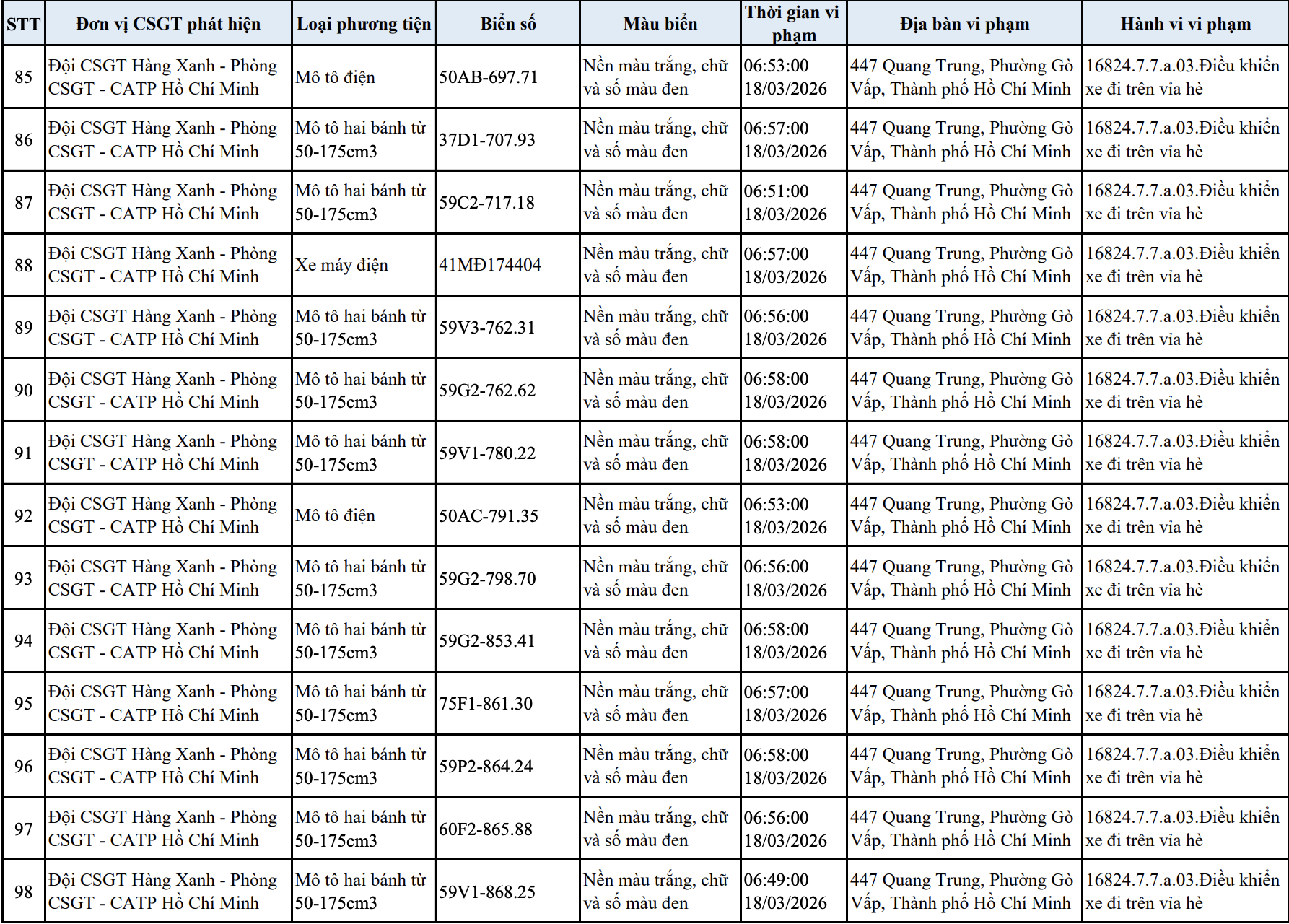 Tại TP.HCM, ngày 23/3, Đội CSGT Hàng Xanh (thuộc Phòng CSGT PC08, Công an TP.HCM) cho biết đơn vị đã ghi nhận và gửi thông báo vi phạm đến 103 trường hợp người điều khiển xe máy chạy lên vỉa hè trên tuyến đường Quang Trung, phường Gò Vấp.