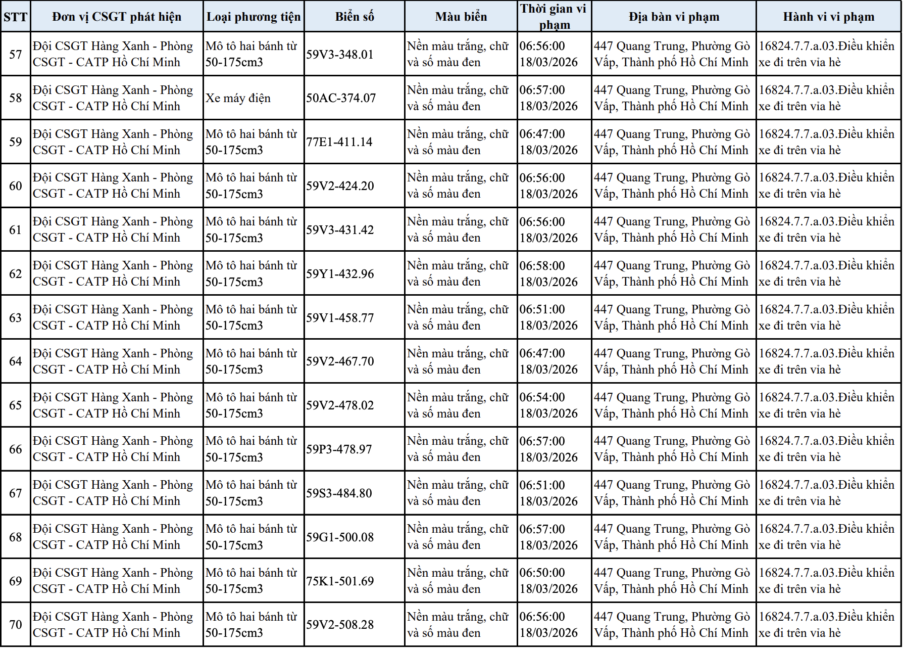 Danh sách các phương tiện vi phạm tại TP.HCM như sau: