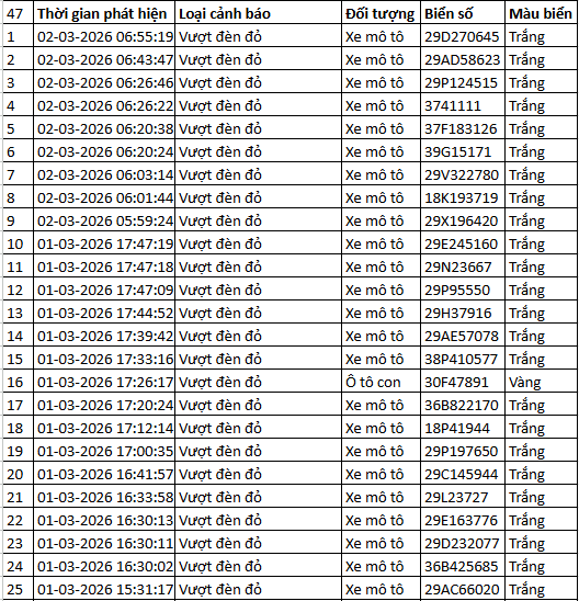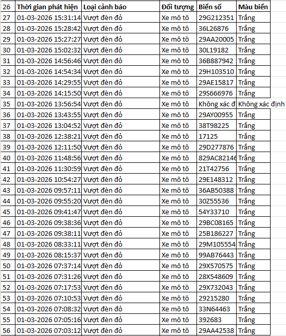 Cục Cảnh sát giao thông thông báo, từ 7h30’ ngày 1/3/2026 đến 7h30’ ngày 2/3/2026, qua trích xuất dữ liệu từ camera A.I được thí điểm lắp đặt tại nội đô Hà Nội (nút giao phố Phạm Văn Bạch - Hoàng Quán Chi), đã tự động phát hiện: 55 trường hợp không chấp hành hiệu lệnh của đèn tín hiệu - vượt đèn đỏ. Danh sách cụ thể như sau:
