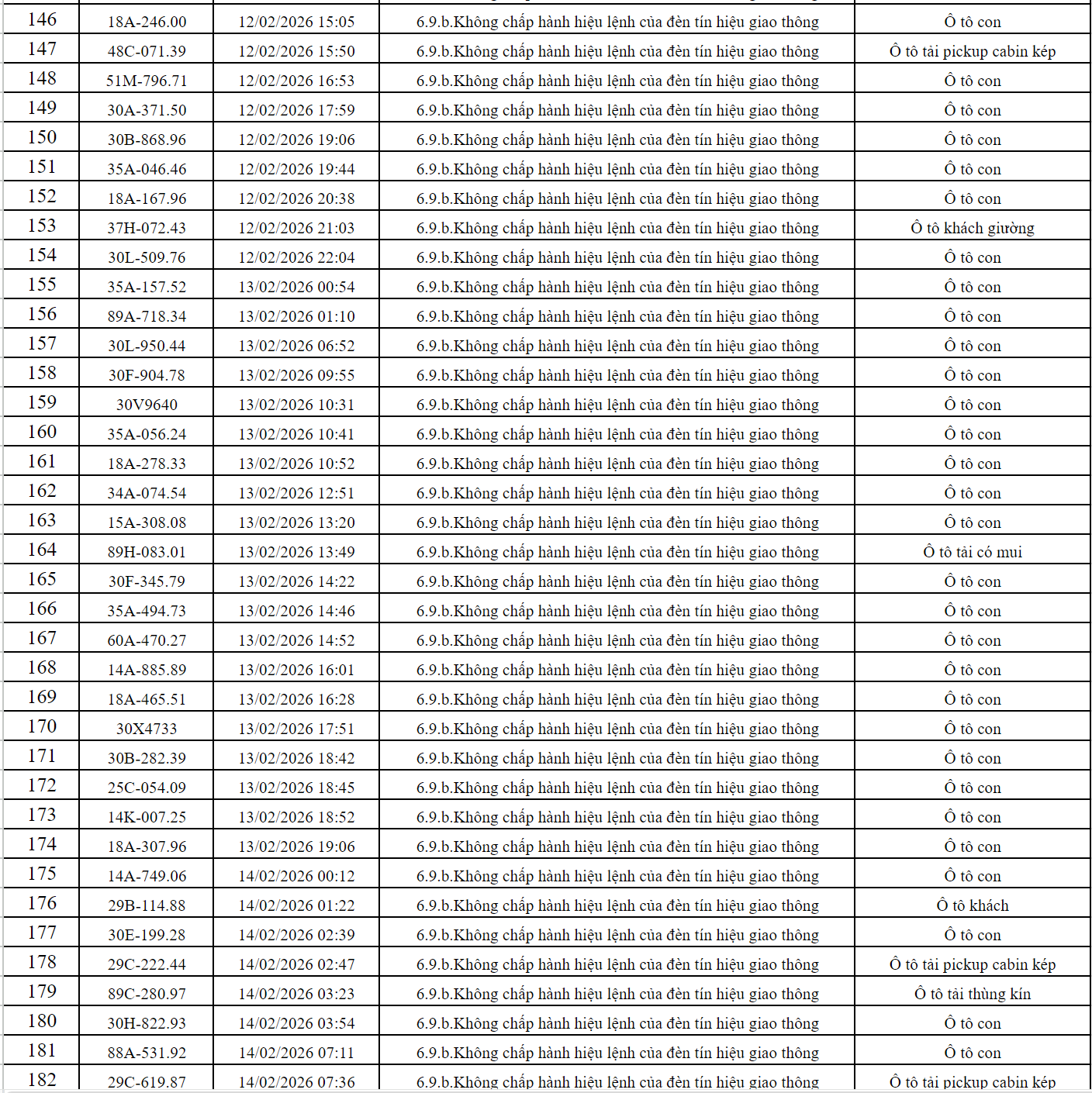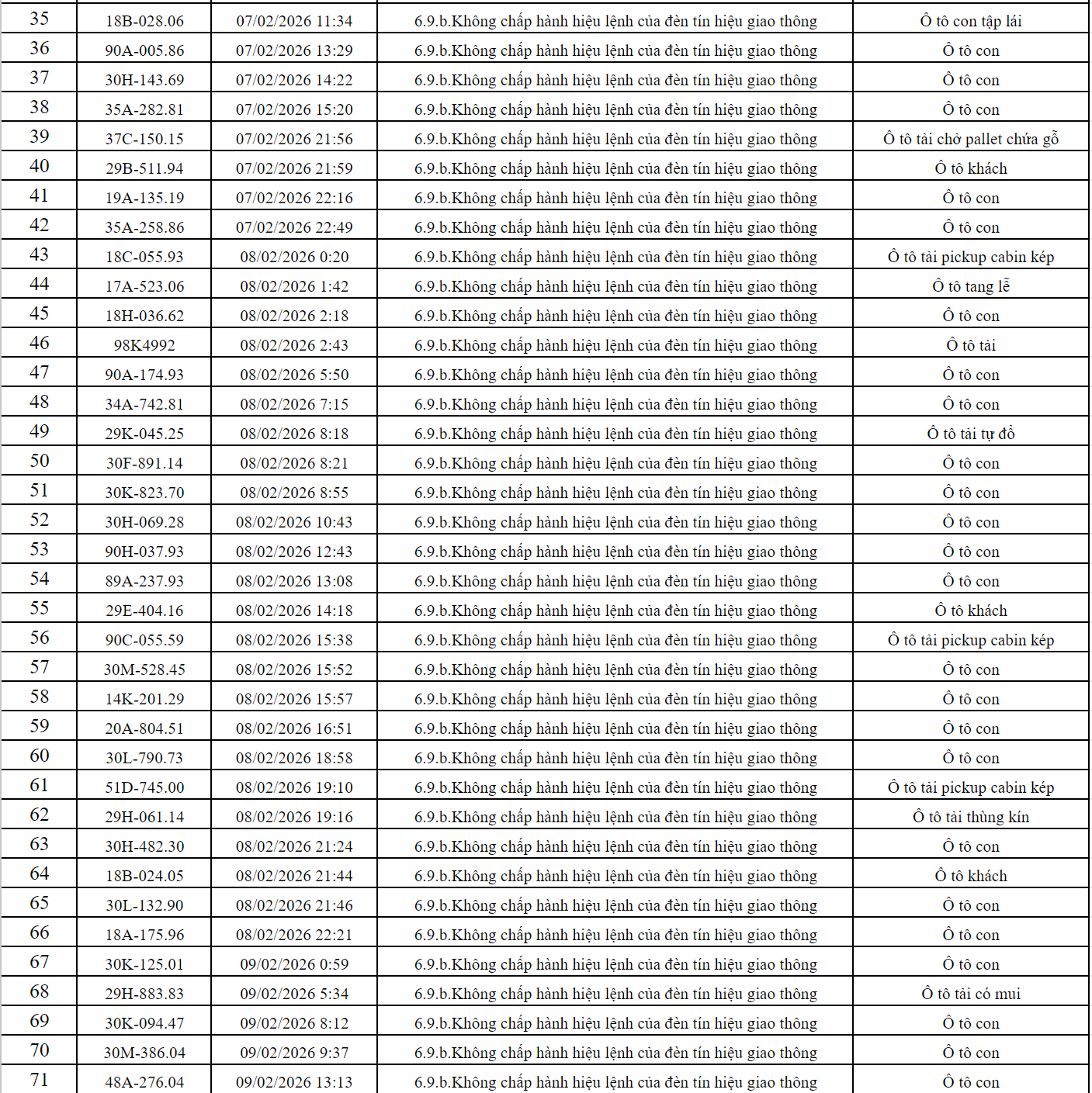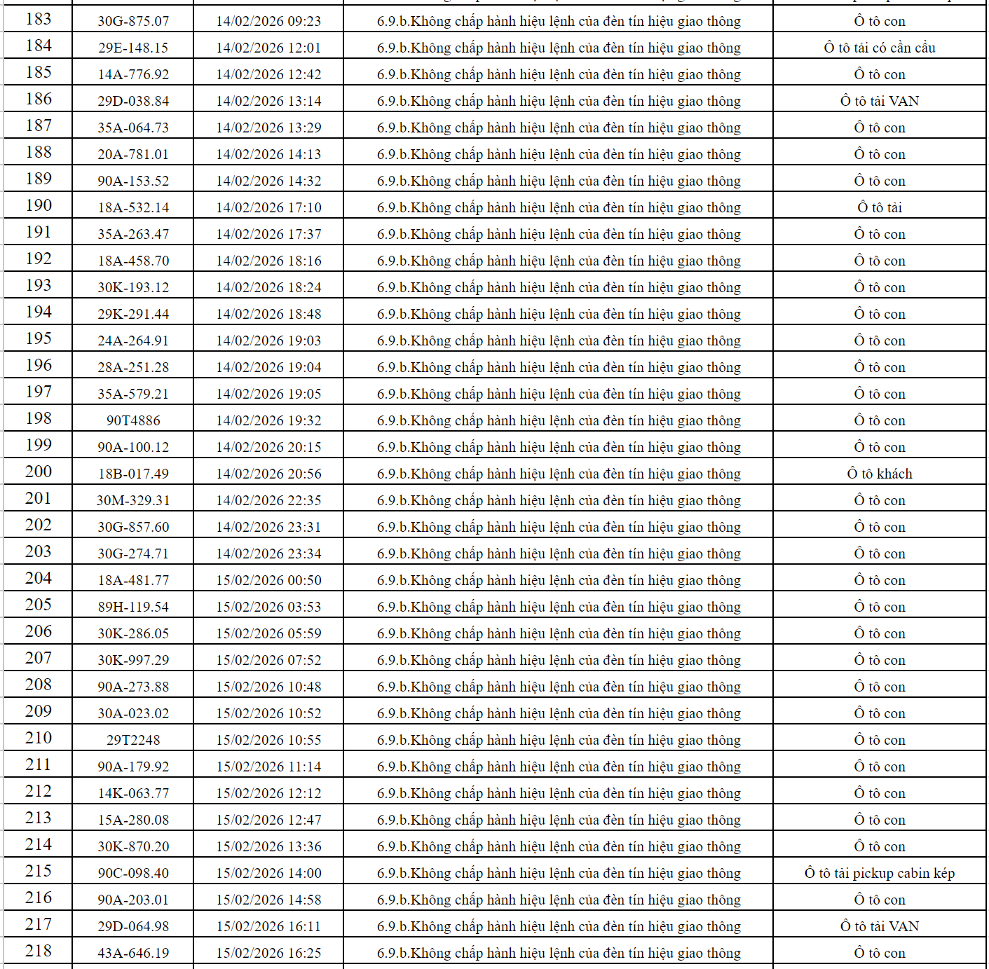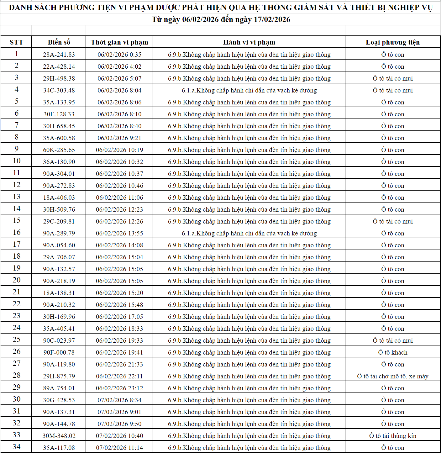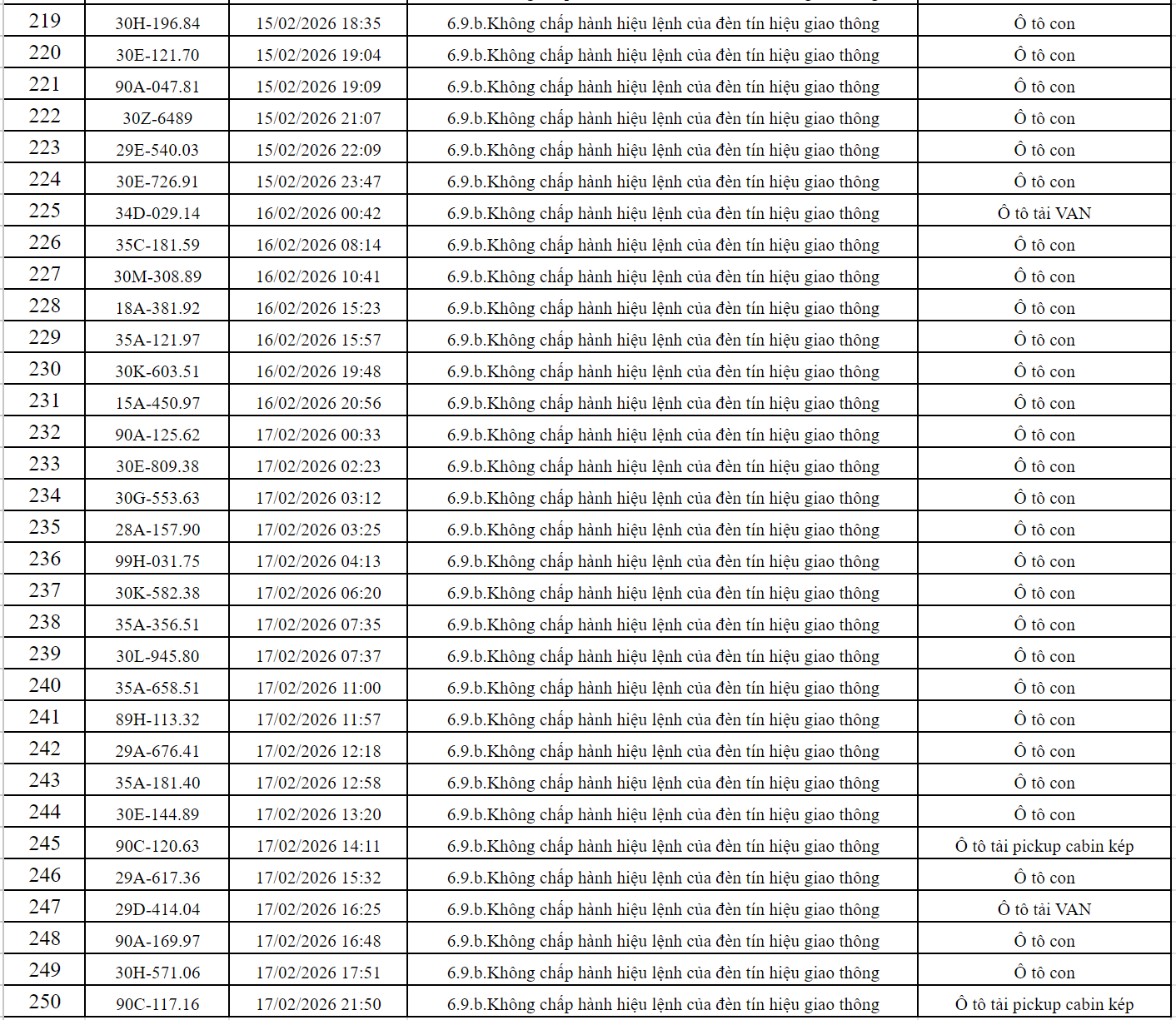 Theo thông báo của Phòng Cảnh sát giao thông Công an tỉnh Ninh Bình, từ ngày 06/02/2026 đến ngày 17/02/2026 đã phát hiện 250 trường hợp phương tiện vi phạm trật tự an toàn giao thông qua hệ thống camera giám sát giao thông và phương tiện thiết bị kỹ thuật nghiệp vụ. Trong đó, lỗi vi phạm phổ biến nhất là không chấp hành hiệu lệnh của đèn tín hiệu giao thông. Danh sách cụ thể như sau:
