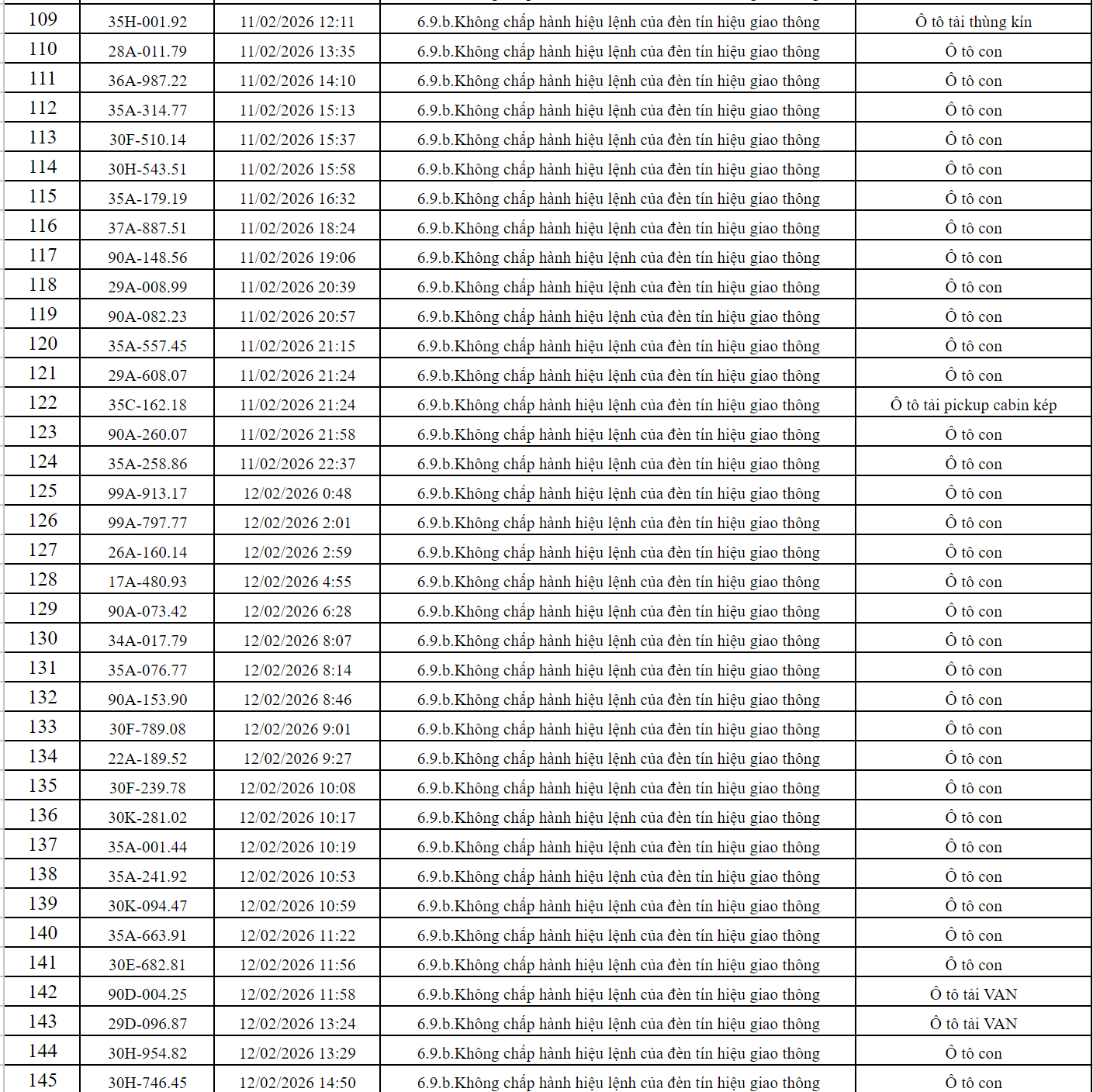 Theo thông báo của Phòng Cảnh sát giao thông Công an tỉnh Hưng Yên, trong thời gian từ ngày 23/2/2026 - 01/3/2026 đã ghi nhận 6 phương tiện vi phạm lỗi không chấp hành hiệu lệnh của đèn tín hiệu giao thông. Danh sách cụ thể như sau: