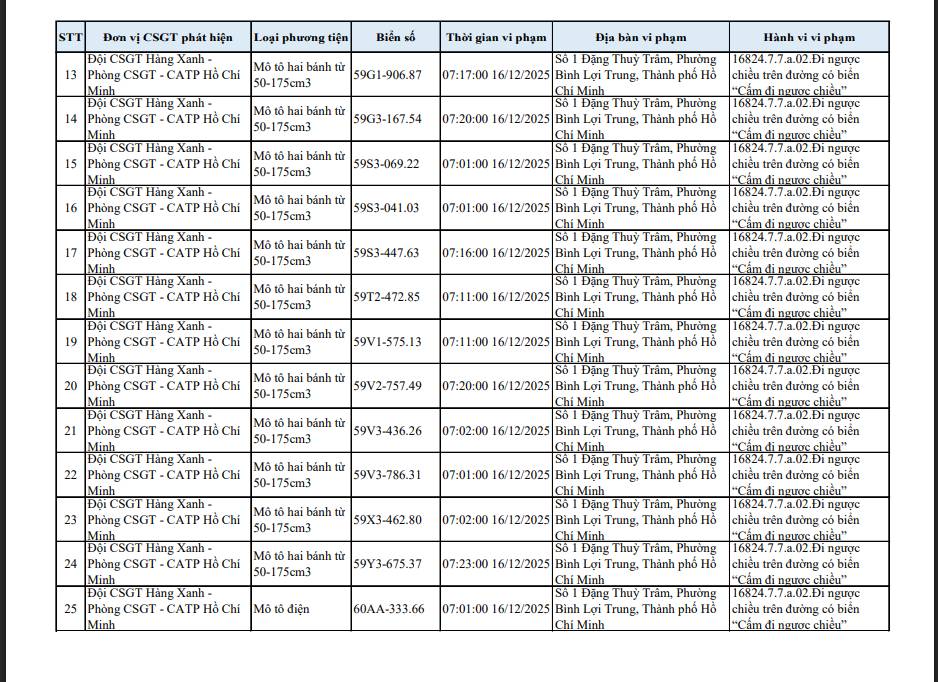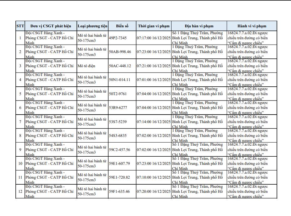 Sáng 16-12, Đội CSGT Hàng Xanh đã ghi hình và gửi thông báo đối với 40 trường hợp vi phạm "Đi ngược chiều trên đường có biển 'Cấm đi ngược chiều'" tại khu vực đường Đặng Thùy Trâm, phường Bình Lợi Trung.