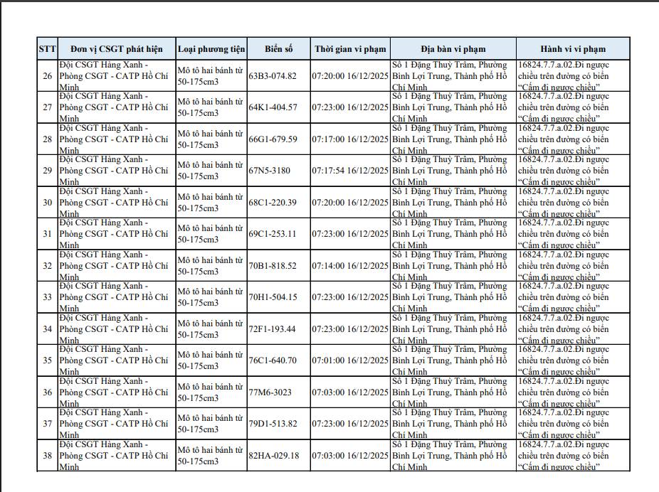 Ngày 22/12, Phòng CSGT Công an TPHCM cho biết đã gửi thông báo phạt nguội 40 xe máy đi ngược chiều trên đường Đặng Thùy Trâm, phường Bình Lợi Trung.
