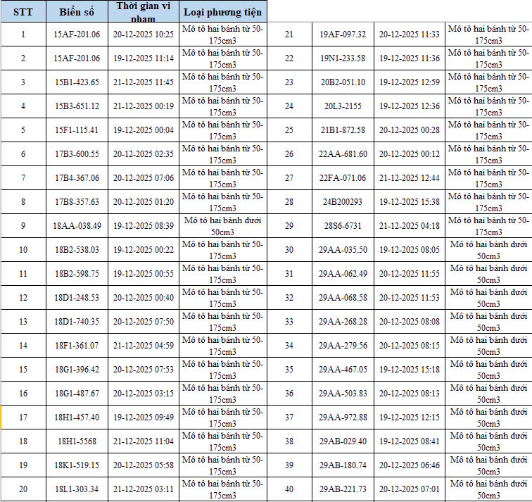 Mới đây, Công an thành phố Hà Nội thông báo danh sách 342 phương tiện vi phạm TTATGT được phát hiện thông qua hệ thống camera AI trong thời gian từ 19/12/2025 đến 21/12/2025. Trong số này có 260 xe máy vi phạm các lỗi như vượt đèn đỏ, đi sai làn, không chấp hành hiệu lệnh giao thông. Phòng Cảnh sát giao thông đã gửi thông báo vi phạm đến các chủ phương tiện theo quy định.