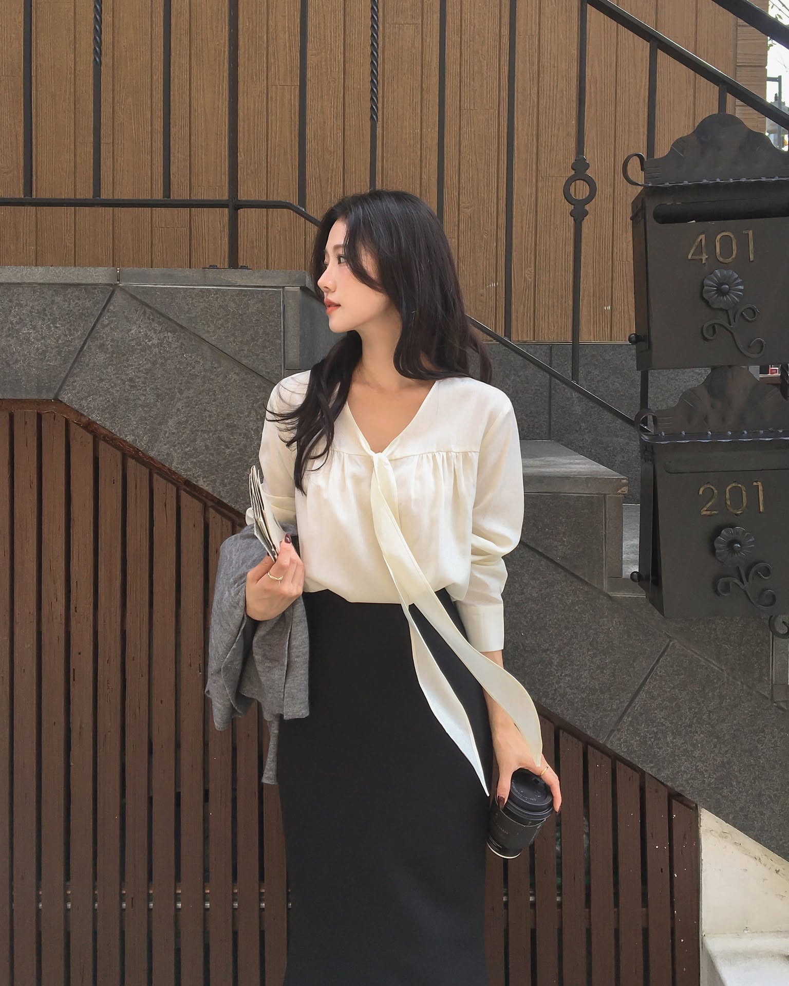 Áo blouse trắng gần như là món đồ "kinh điển" trong tủ đồ công sở. Khi kết hợp cùng chân váy, đặc biệt là váy bút chì hoặc váy chữ A, bạn sẽ có ngay một outfit vừa thanh lịch vừa nữ tính. Điểm thú vị nằm ở chỗ áo blouse không hề nhàm chán như nhiều người nghĩ, từ tay bồng, cổ nơ đến chất liệu voan nhẹ đều mang lại cảm giác mềm mại và thời trang hơn.
