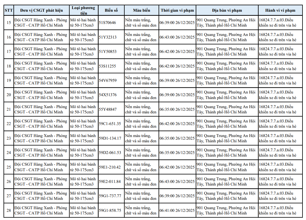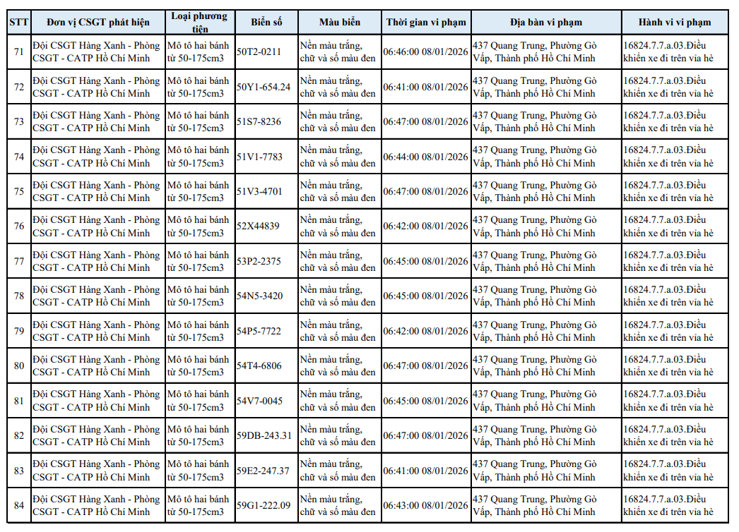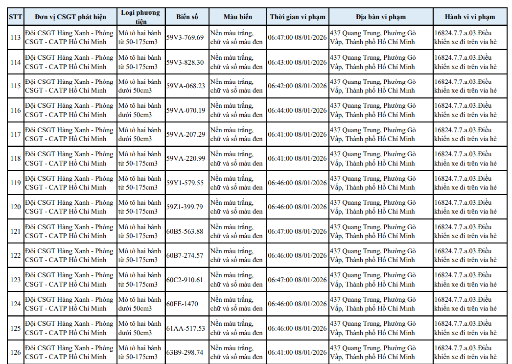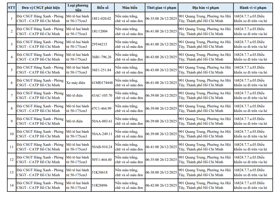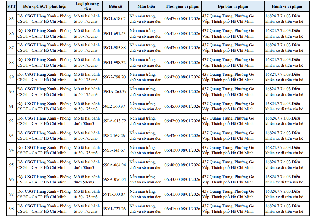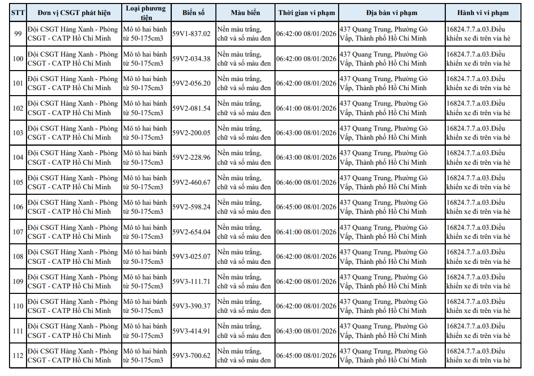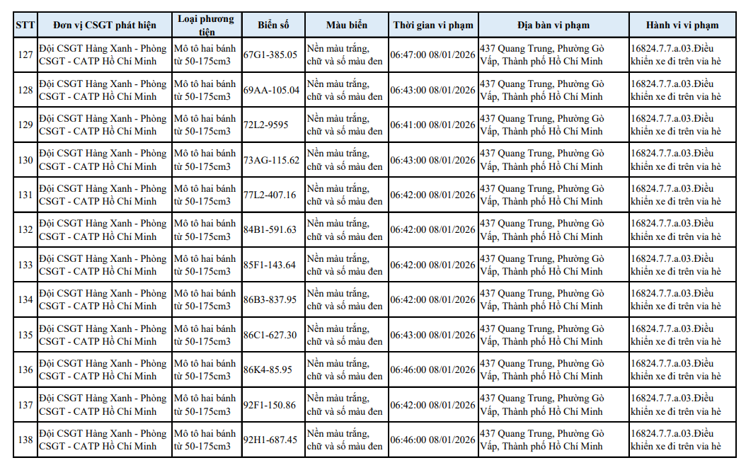 Mới đây, Đội CSGT Hàng Xanh, Phòng Cảnh sát giao thông (PC08), Công an TP.HCM đã có thông báo nhiều trường hợp vi phạm trật tự, an toàn giao thông. Chỉ trong thời gian ngắn, Đội CSGT Hàng Xanh đã ghi hình, gửi thông báo vi phạm đối với 138 trường hợp xe máy đi trên vỉa hè. Các hình ảnh vi phạm được ghi nhận là căn cứ để xử lý nghiêm đúng quy định của pháp luật.
