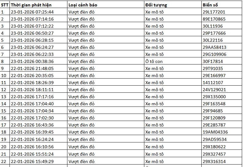 Từ 12h00’ ngày 21/1/2026 đến 12h00’ ngày 22/1/2026, đã phát hiện 38 trường hợp xe máy vi phạm.
