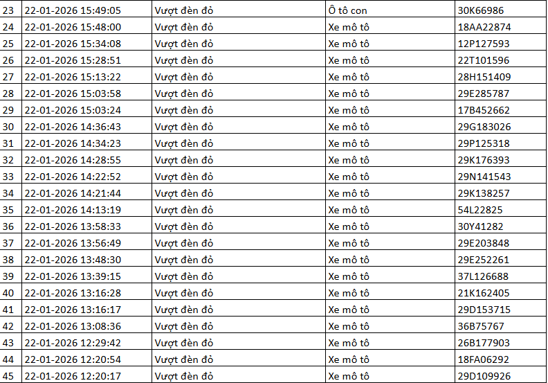 Từ 12h00’ ngày 22/1/2026 đến 12h00’ ngày 23/1/2026, đã phát hiện 66 trường hợp xe máy vi phạm.