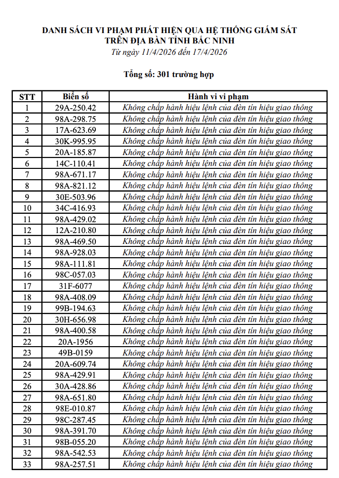 Bên cạnh đó, tại Bắc Ninh lực lượng chức năng cũng ghi nhận thêm 301 trường hợp vi phạm trật tự an toàn giao thông trong khoảng thời gian từ ngày 11/4 đến 17/4/2026, thông qua hệ thống giám sát và xử lý vi phạm tự động.