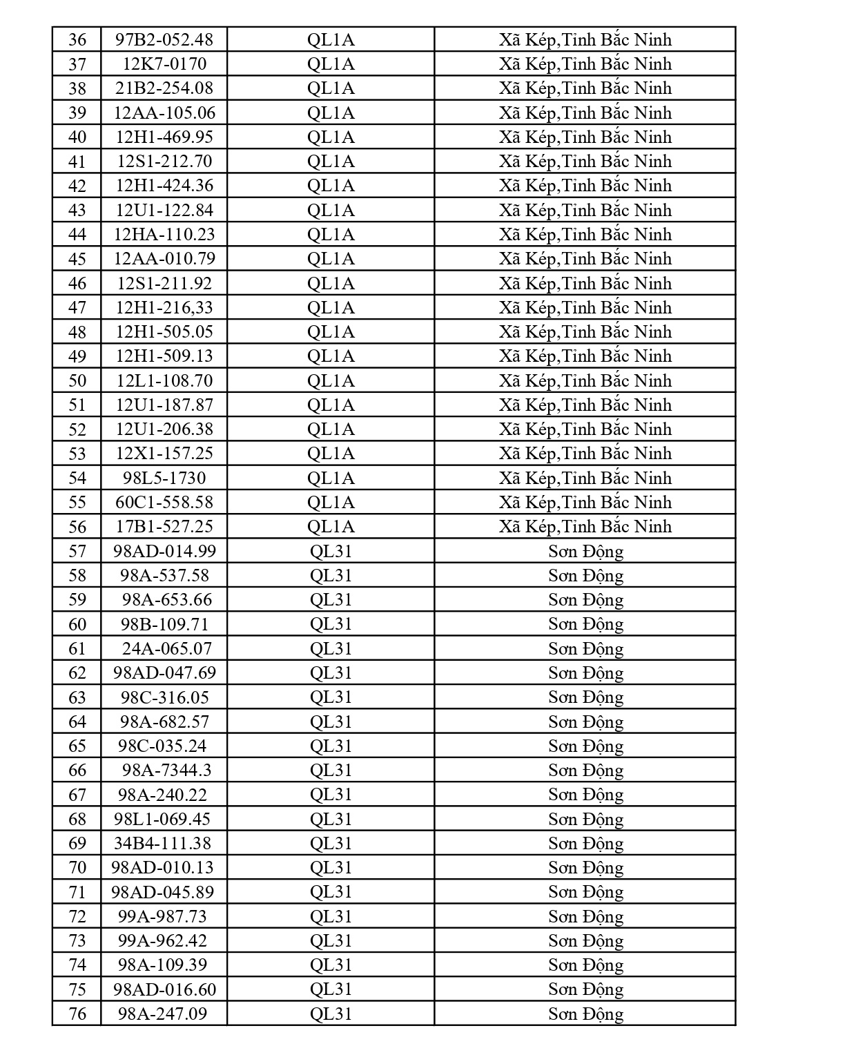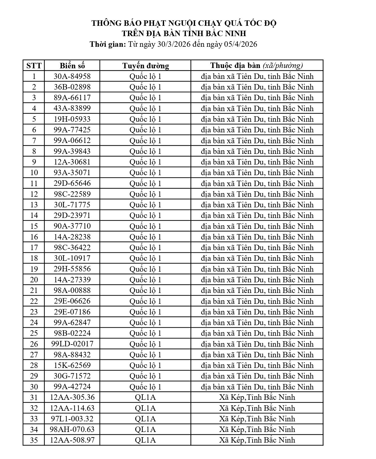 Công an tỉnh Bắc Ninh mới đây đã công bố danh sách các phương tiện vi phạm lỗi chạy quá tốc độ từ ngày 30/3/2026 đến ngày 05/4/2026.