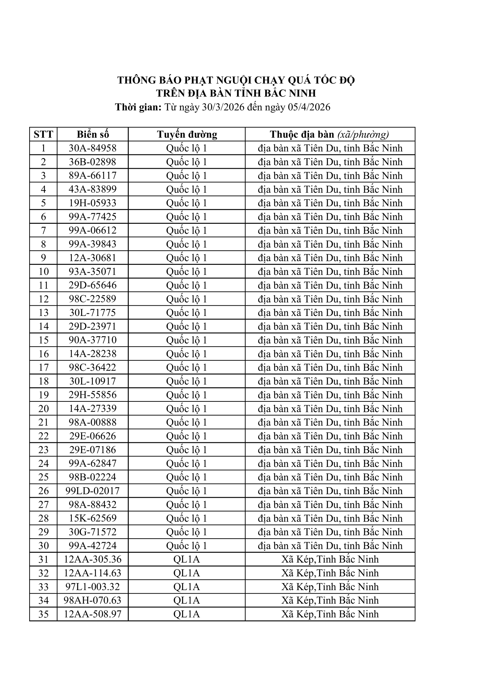 Phòng Cảnh sát Giao thông - Công an tỉnh Bắc Ninh mới đây đã ra thông báo danh sách các phương tiện vi phạm Luật giao thông đường bộ từ ngày 30/3/2026 đến ngày 05/4/2026. Thông qua các phương tiện, thiết bị kỹ thuật nghiệp vụ, Phòng Cảnh sát giao thông Công an tỉnh Bắc Ninh đã phát hiện tổng cộng 564 trường hợp vi phạm quy định về tốc độ.