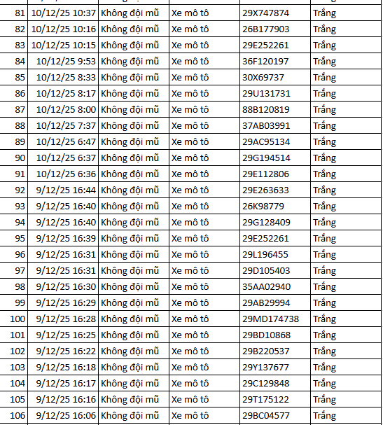 Danh sách 148 trường hợp xe máy vi phạm như sau: