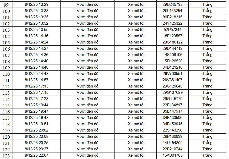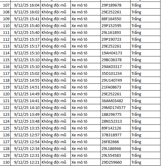 Danh sách 129 trường hợp xe máy vi phạm như sau: