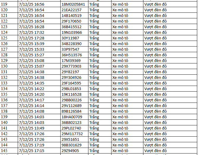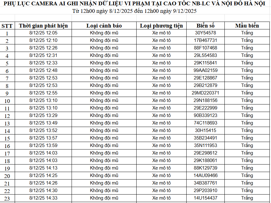 Theo Cục Cảnh sát giao thông, Từ 12h00’ ngày 7/12/2025 đến 12h00’ ngày 8/12/2025, qua trích xuất dữ liệu từ camera A.I được thí điểm lắp đặt tại nội đô Hà Nội (nút giao phố Phạm Văn Bạch - Hoàng Quán Chi), đã tự động phát hiện 148 trường hợp xe mô tô (xe máy) vi phạm.