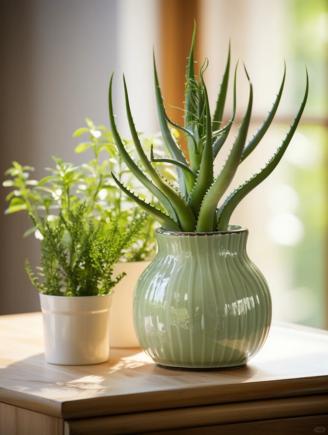 Thú vị hơn, nha đam còn là "bác sĩ" tại gia. Nếu chẳng may lúc nấu ăn bị bỏng mỡ nhẹ, bạn chỉ cần bẻ một nhánh nha đam, lấy phần gel trong suốt bôi lên vết thương, cảm giác rát sẽ dịu đi ngay lập tức. Nha đam ưa sáng hơn các loại cây trên một chút, nên bệ cửa sổ bếp là nơi hoàn hảo nhất cho nó.