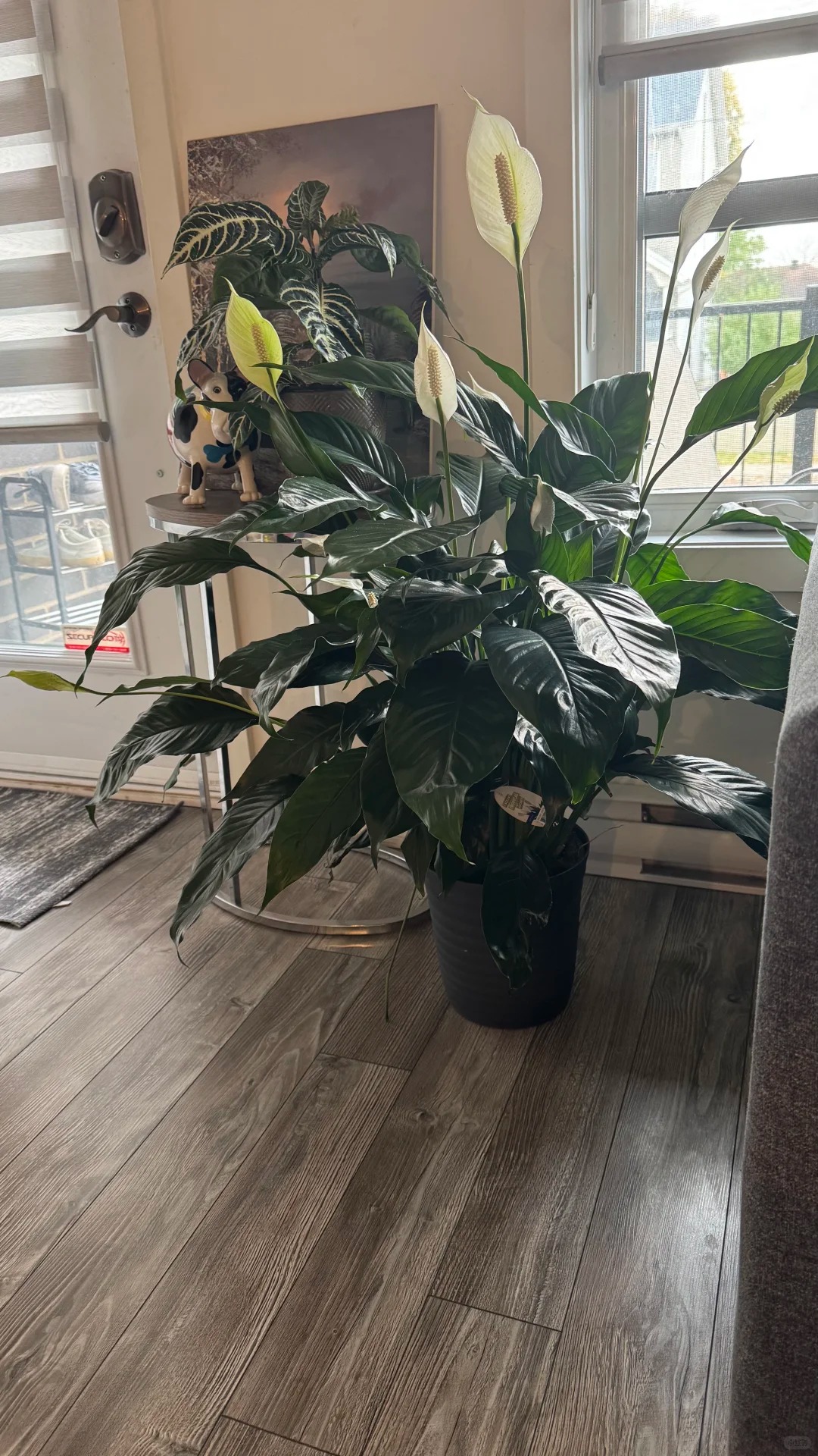 Hoa lan ý màu trắng thanh nhã, nở theo mùa, tạo cảm giác dịu mắt trong phòng.