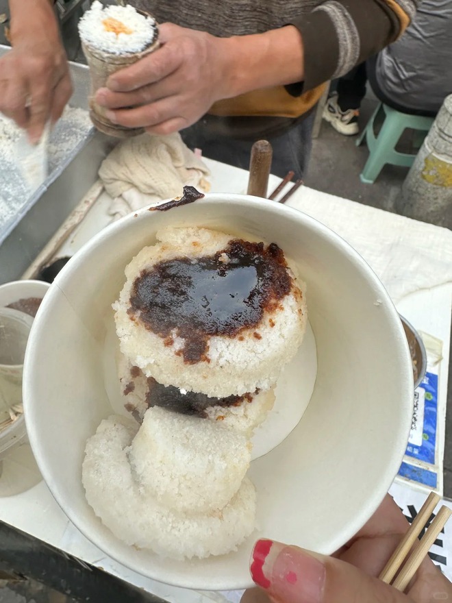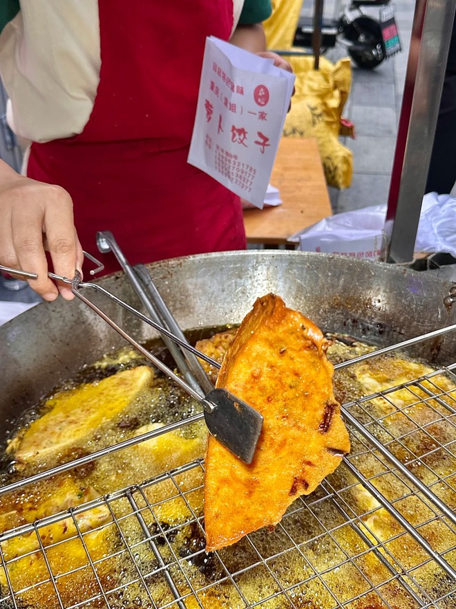 Cắn một miếng, lớp vỏ ngoài giòn rụm vỡ ra, để lộ phần nhân củ cải thanh ngọt, mềm ẩm tươm nước, chút cay nồng của tiêu ớt làm bừng tỉnh mọi giác quan. Cầm 5 tệ (khoảng mười mấy ngàn đồng) mua chiếc bánh nóng hổi vừa thổi vừa ăn giữa chợ sớm, cảm giác ấy bình yên đến lạ.