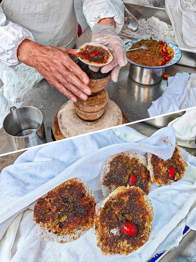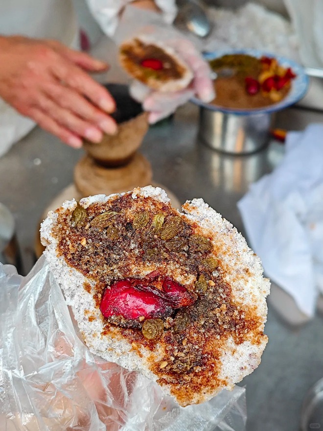 Cuối cùng, không thể bỏ qua món bánh nướng men (Hỏa Thiêu Mô) thô mộc rải rác khắp các con hẻm. Nó đóng vai trò y hệt như chiếc bánh mì đặc ruột truyền thống của Việt Nam – rẻ tiền, no lâu và cực kỳ đa năng. Không men công nghiệp, không phụ gia, bột mì được ủ lên men tự nhiên qua 3 lần nhào nặn cật lực bằng tay cho đến khi mịn màng. Bánh được nặn thành hình tròn dẹt, áp chảo hoặc nướng trong lò đất lửa nhỏ cho đến khi lớp vỏ ngoài vàng ươm, nứt nẻ, còn bên trong xốp mềm, dai dai.