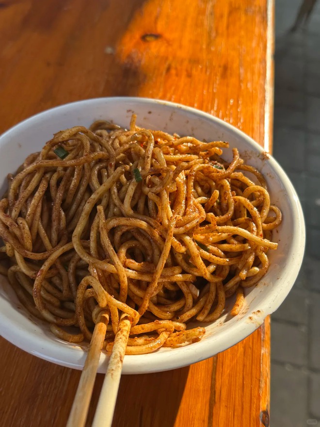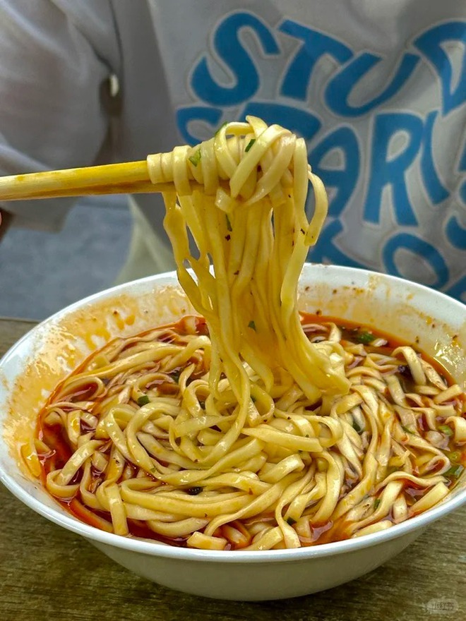 Những hàng mì ở khu Bắc Môn cổ kính lúc nào cũng dài dằng dặc người xếp hàng. Sợi mì kiềm nhào nặn thủ công được chần qua nước sôi sao cho chín tới mà không bị nát, vớt ra ráo nước rồi rưới lên thứ dầu ớt đỏ au bí truyền, thêm chút xì dầu, tỏi băm, đậu phộng rang giã dập và hành lá xắt nhuyễn. Nước dùng áo một lớp váng mỡ đỏ au nhưng không hề gắt cổ, húp một ngụm là thấy cái ấm áp len lỏi khắp lồng ngực.
