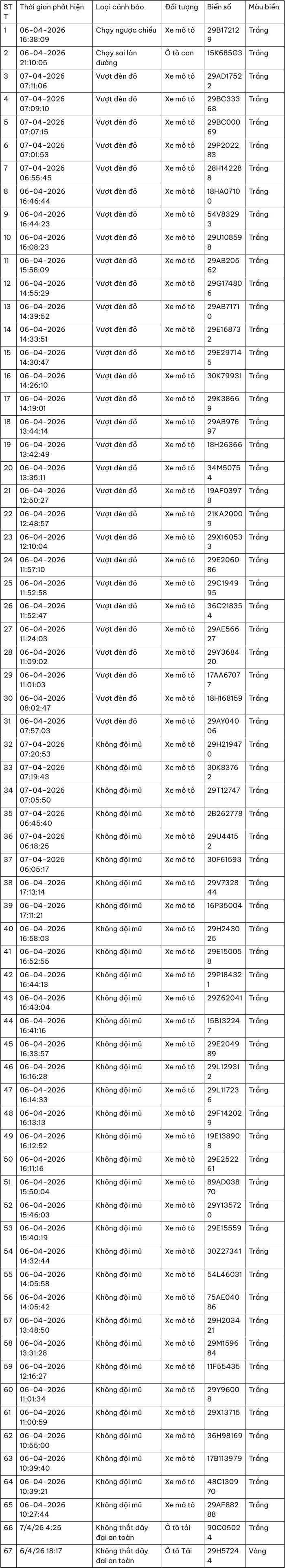 Từ dữ liệu thu thập được, hệ thống đã phân tích và phát hiện 67 trường hợp vi phạm điển hình. Các hành vi chủ yếu được ghi nhận gồm không thắt dây an toàn, sử dụng điện thoại khi điều khiển phương tiện, vượt đèn đỏ và nhiều lỗi vi phạm khác có nguy cơ cao dẫn đến tai nạn giao thông.