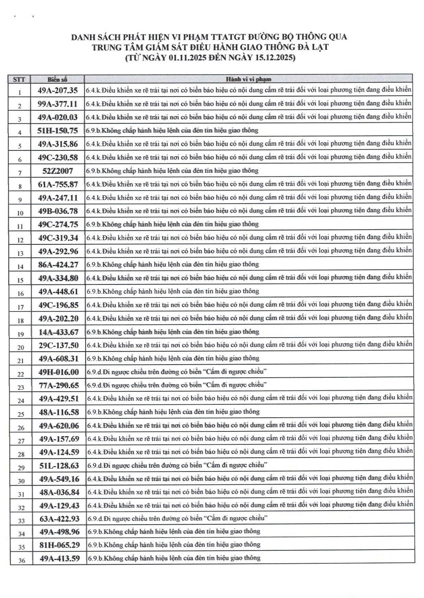 Ngày 24/12, Phòng Cảnh sát giao thông (CSGT), Công an tỉnh Lâm Đồng thông báo danh sách phương tiện vi phạm Luật giao thông đường bộ, từ ngày 01/11/2025 đến ngày 15/12/2025.
