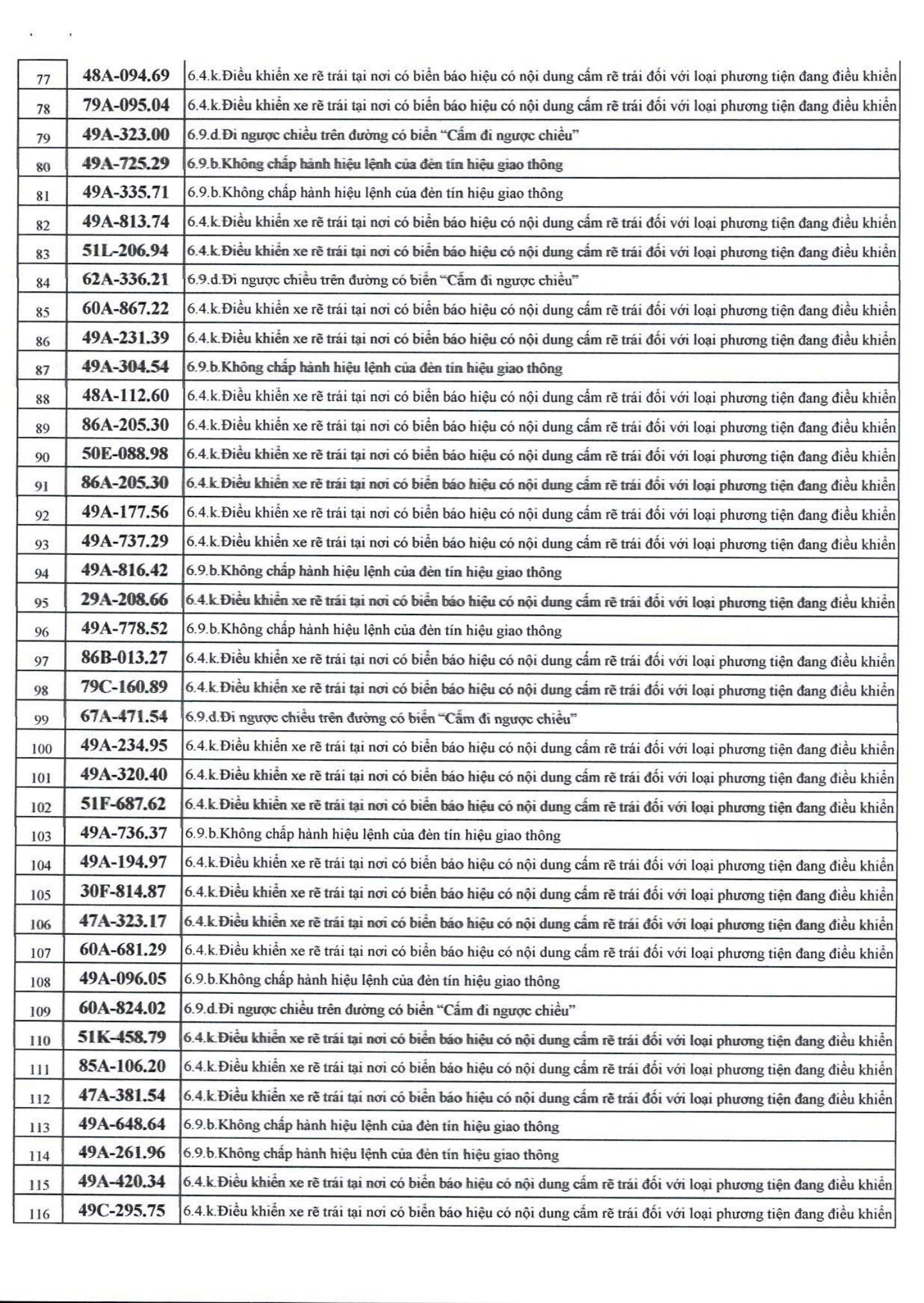 Các lỗi vi phạm chủ yếu: Không chấp hành hiệu lệnh của đèn tín hiệu giao thông; đi ngược chiều trên đường có biển “Cấm đi ngược chiều”; rẽ trái/phải tại nơi cấm rẽ trái/phải.