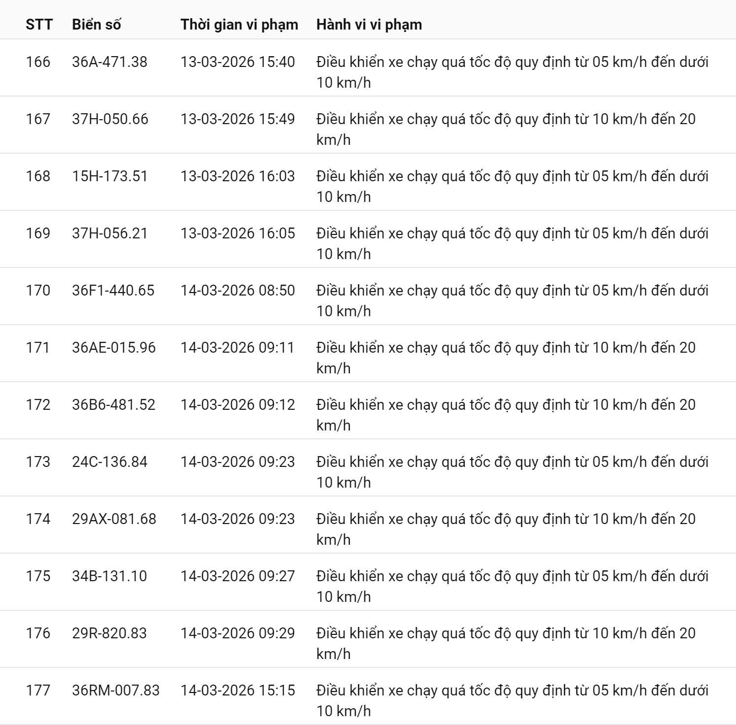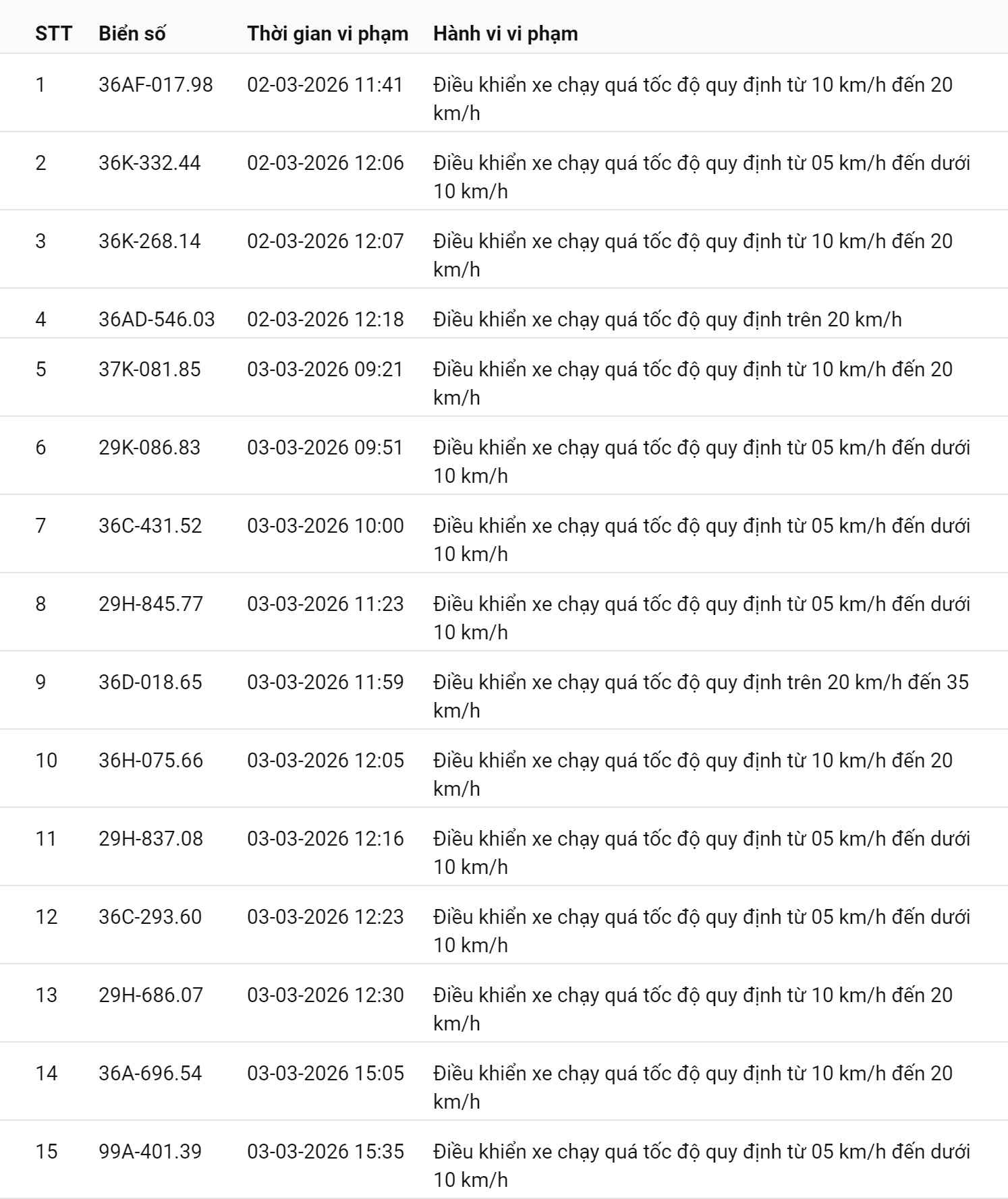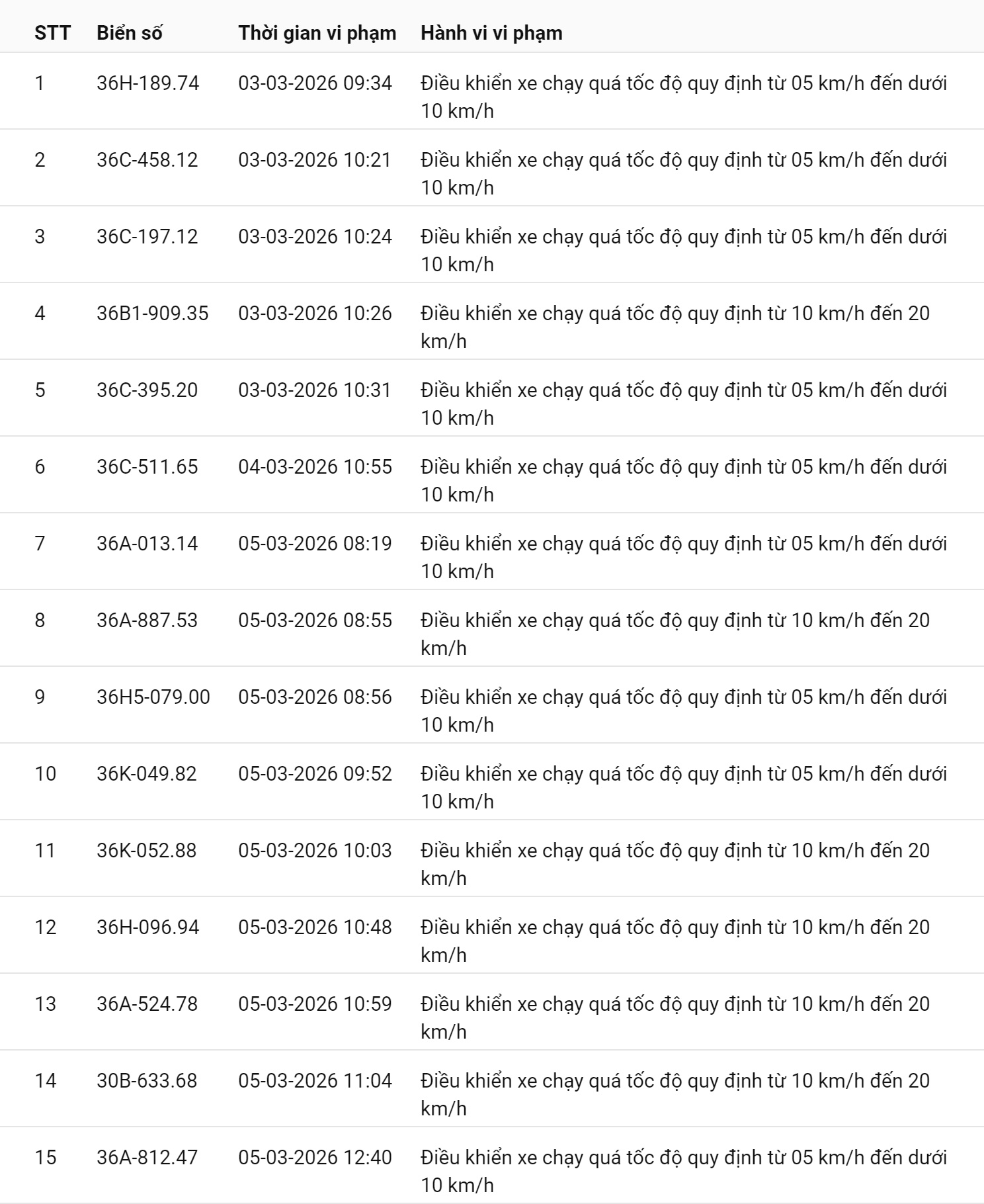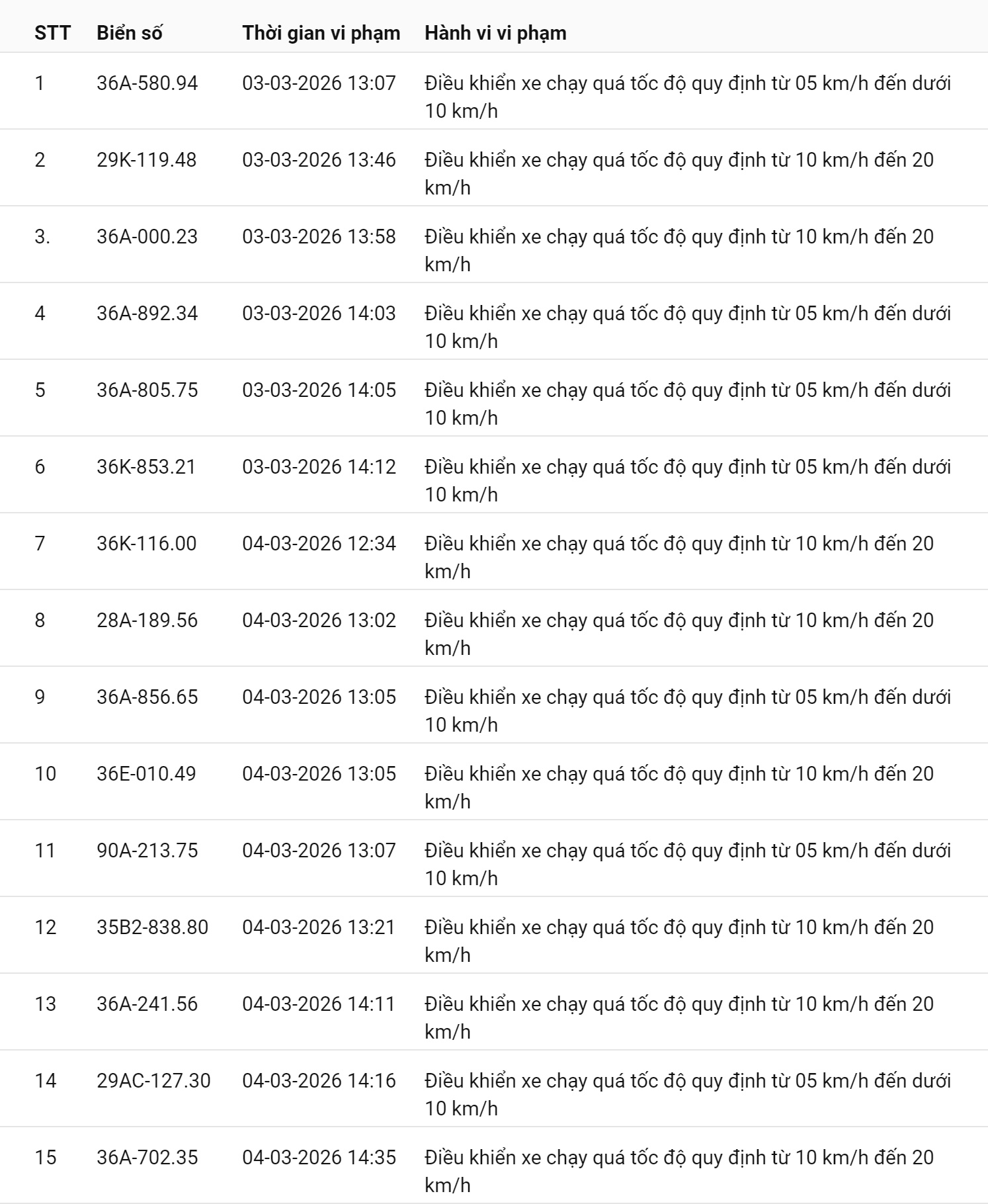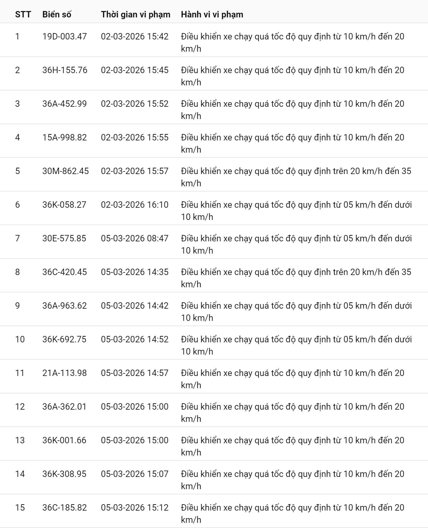 thông báo từ Công an tỉnh Thanh Hóa đăng tải ngày 6/4, thông qua thiết bị kỹ thuật nghiệp vụ, các tổ công tác của phòng CSGT đã phát hiện, ghi nhận bằng hình ảnh đối với tổng số 745 trường hợp phương tiện vi phạm quy định về tốc độ trên các tuyến Quốc lộ trong thời gian từ ngày 01/03/2026 đến ngày 15/03/2026. Danh sách biển số vi phạm cụ thể như sau: