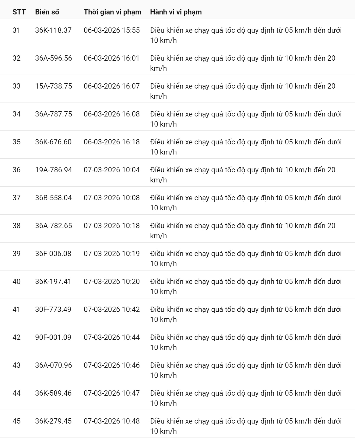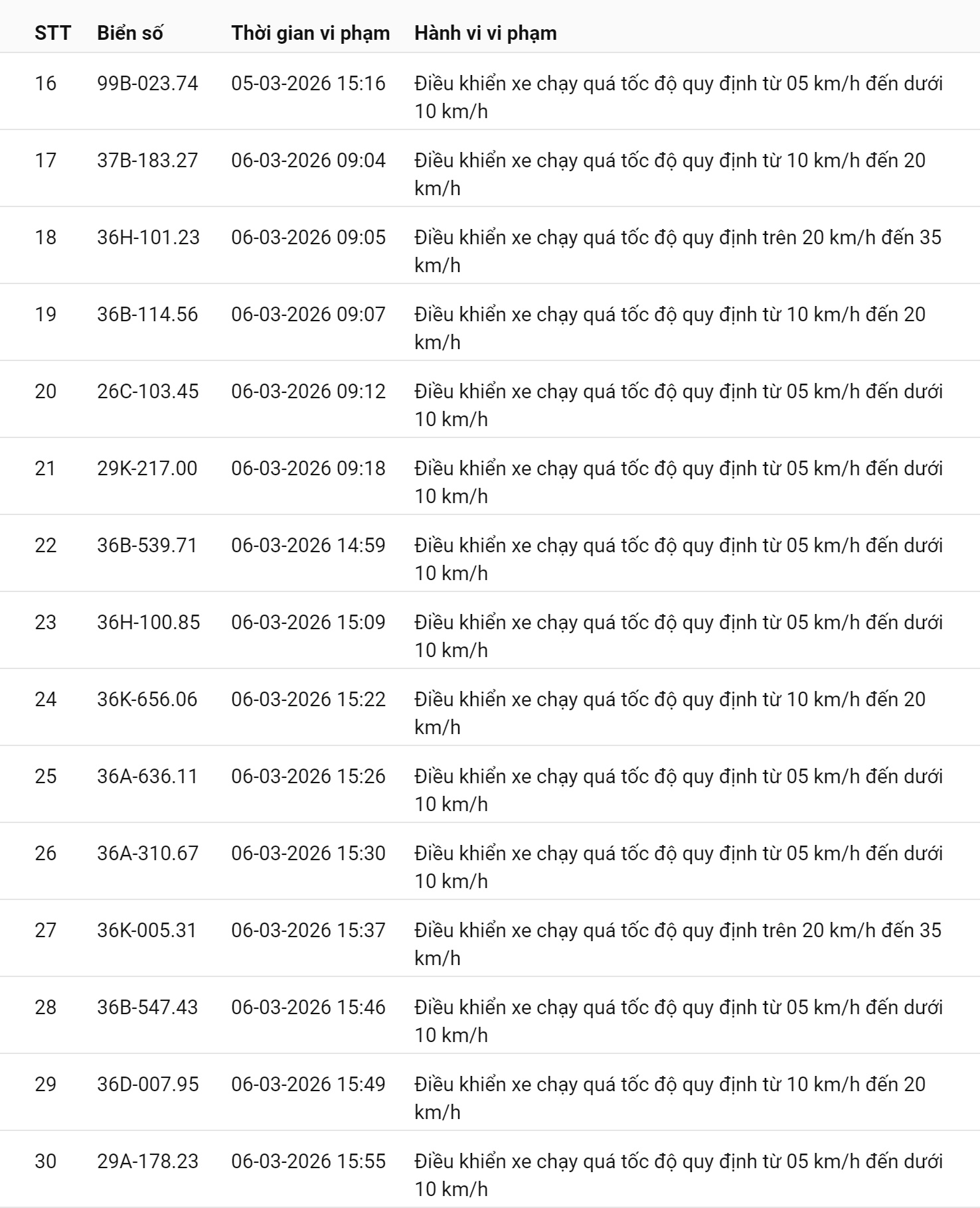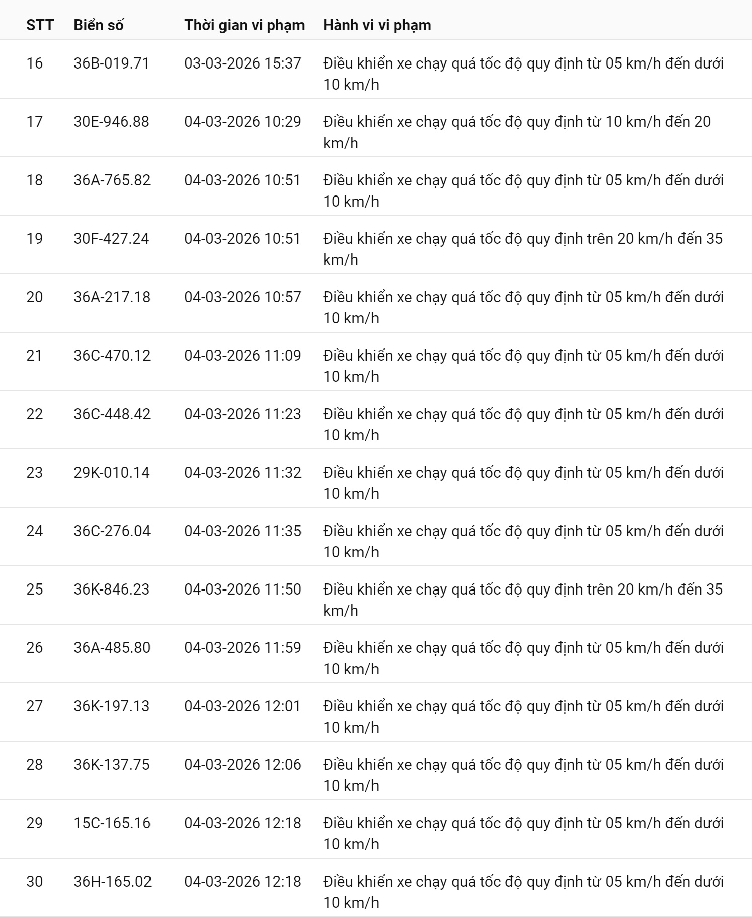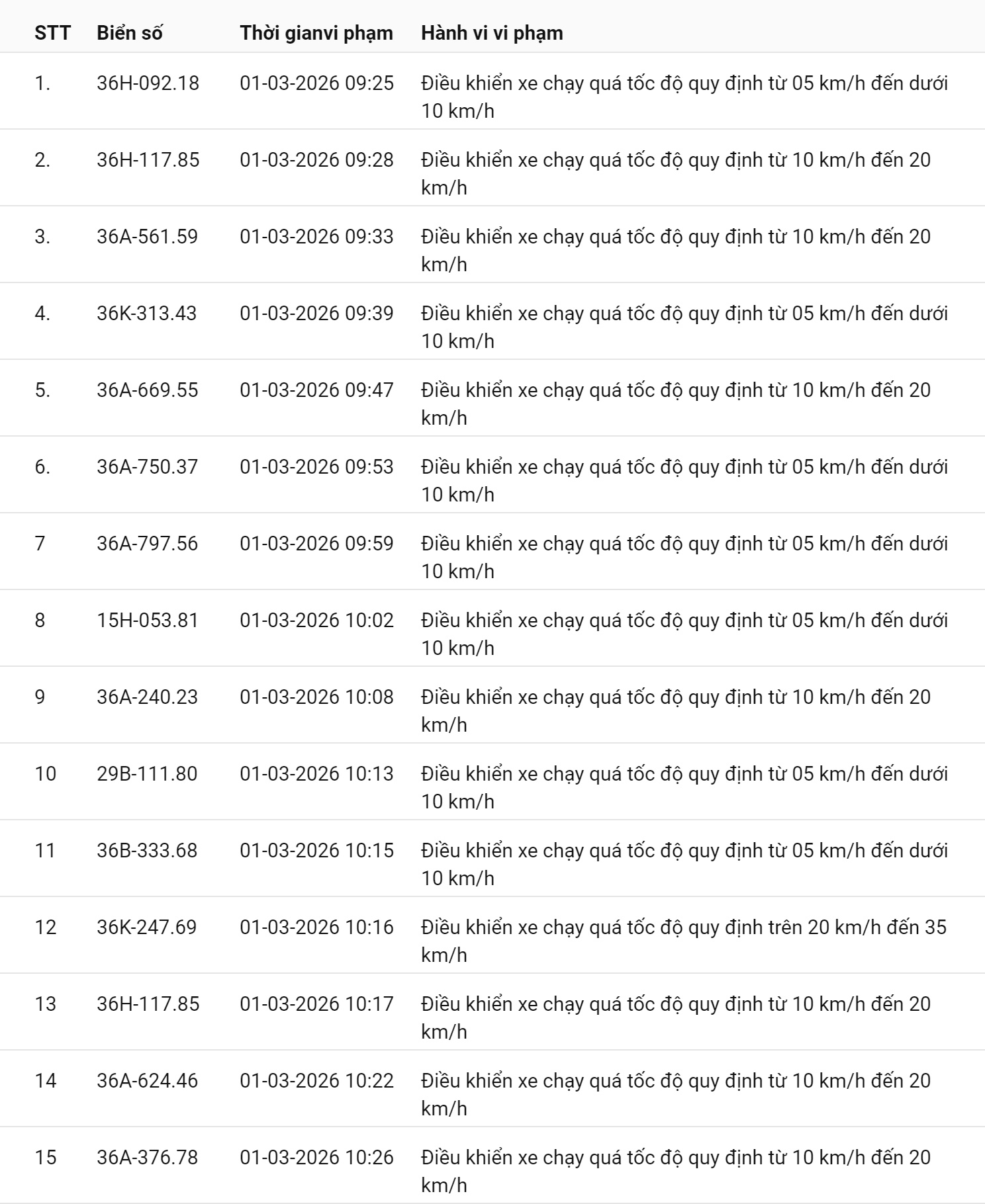 thông báo từ Công an tỉnh Thanh Hóa đăng tải ngày 6/4, thông qua thiết bị kỹ thuật nghiệp vụ, các tổ công tác của phòng CSGT đã phát hiện, ghi nhận bằng hình ảnh đối với tổng số 745 trường hợp phương tiện vi phạm quy định về tốc độ trên các tuyến Quốc lộ trong thời gian từ ngày 01/03/2026 đến ngày 15/03/2026. Danh sách biển số vi phạm cụ thể như sau:
