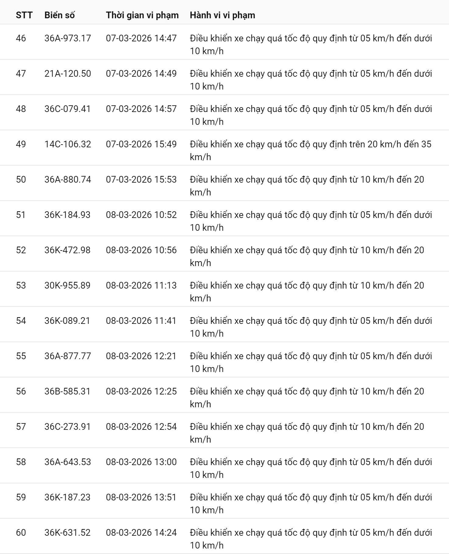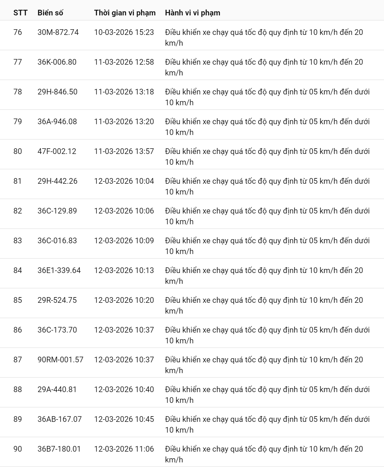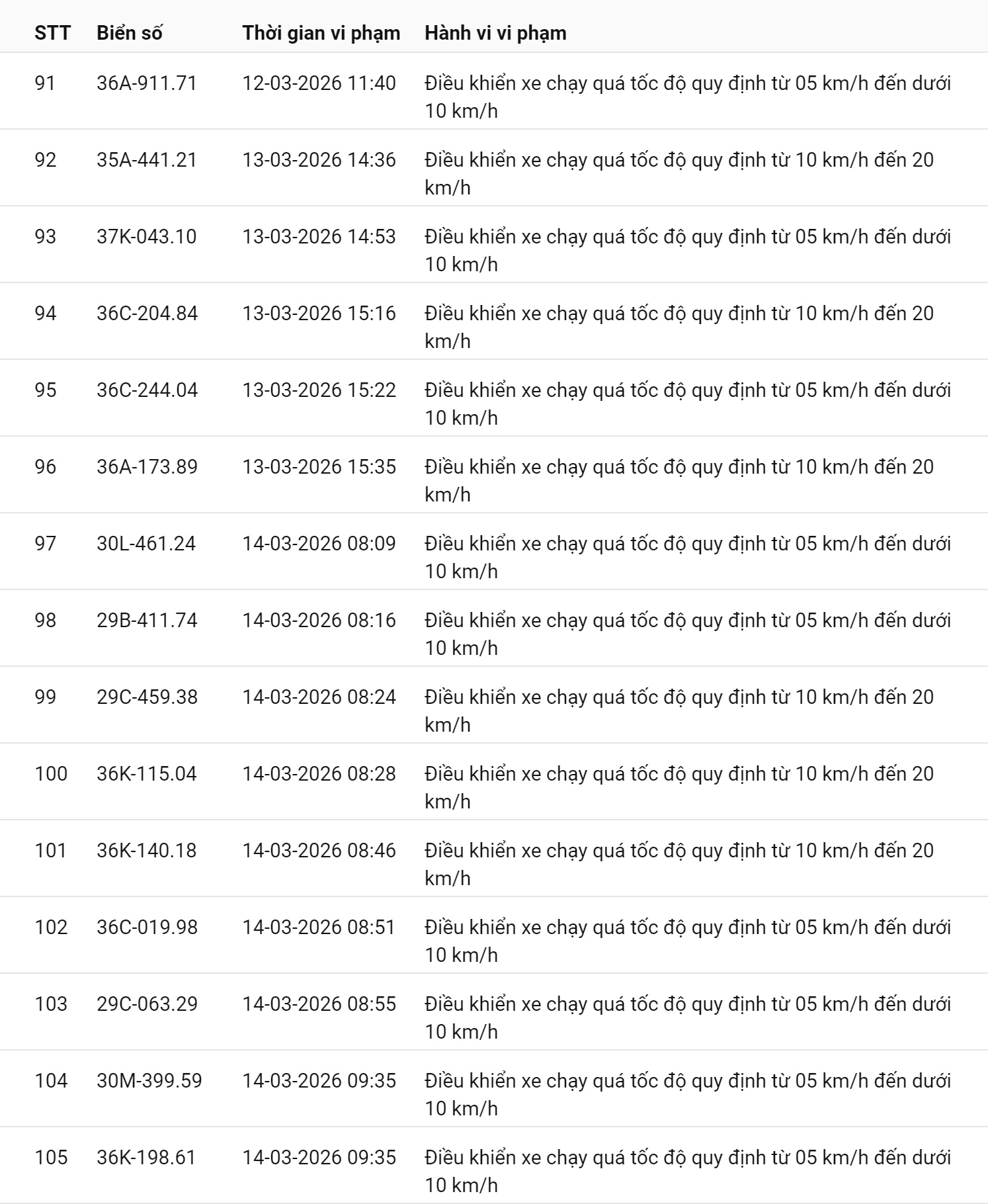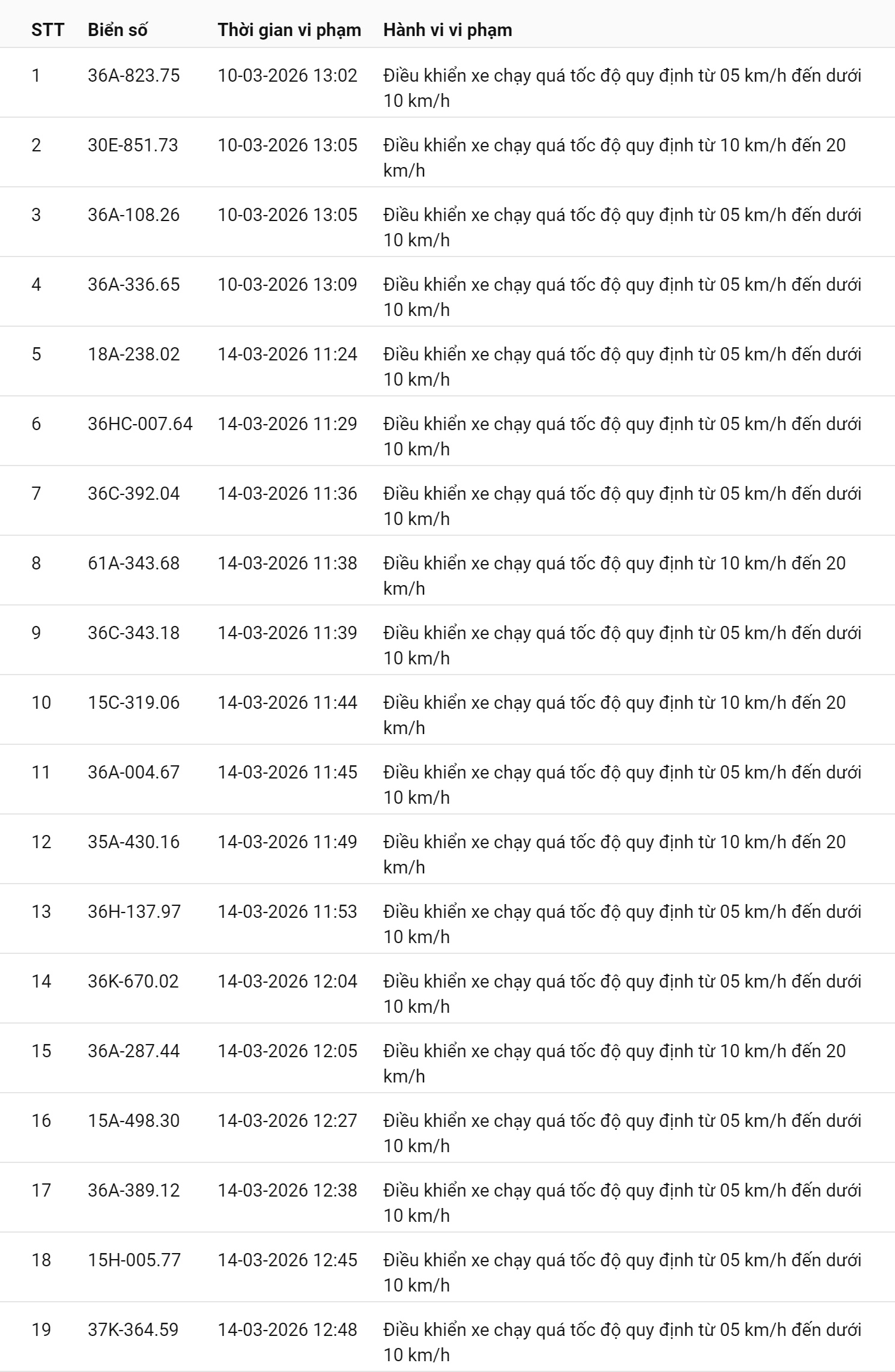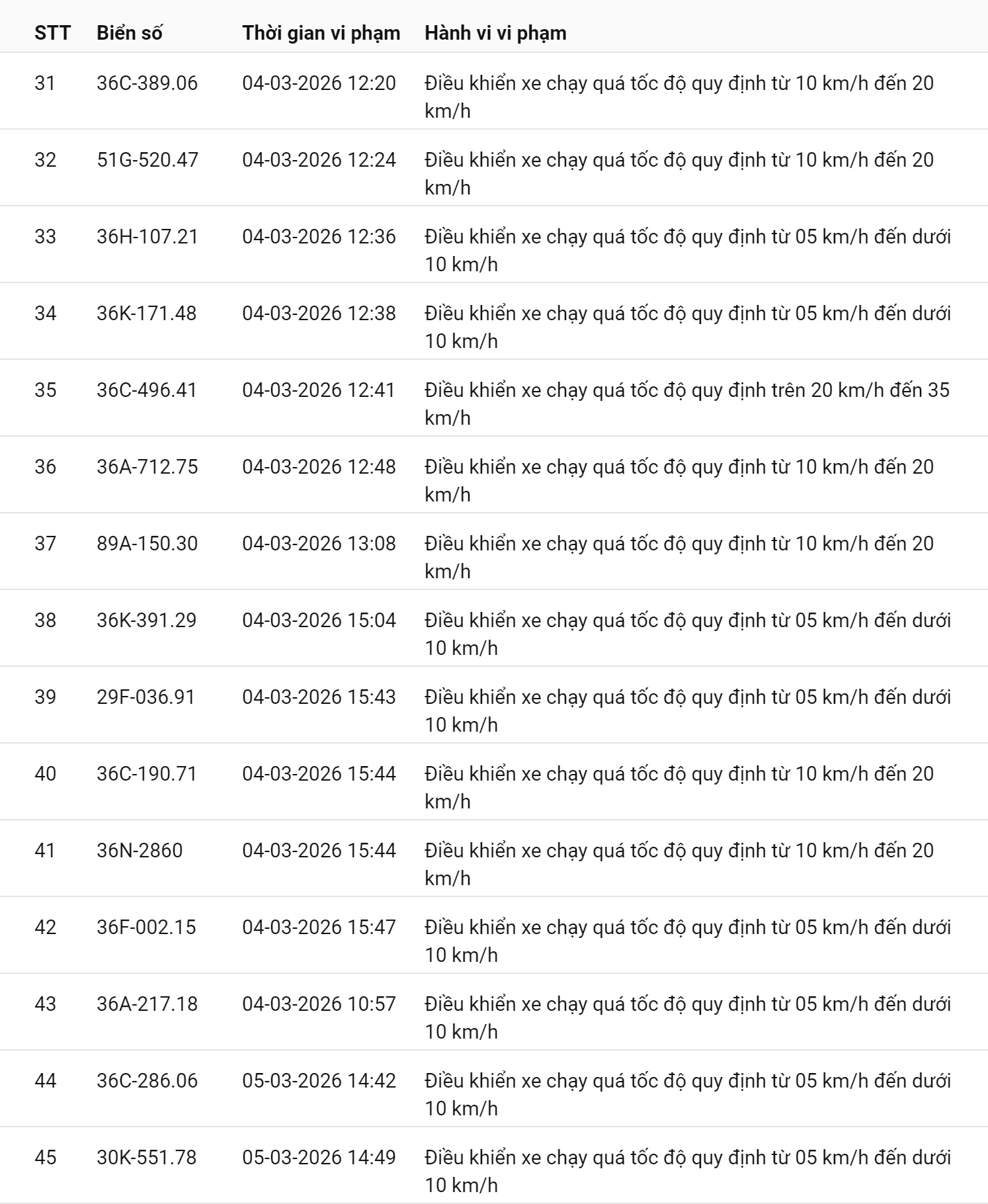 thông báo từ Công an tỉnh Thanh Hóa đăng tải ngày 6/4, thông qua thiết bị kỹ thuật nghiệp vụ, các tổ công tác của phòng CSGT đã phát hiện, ghi nhận bằng hình ảnh đối với tổng số 745 trường hợp phương tiện vi phạm quy định về tốc độ trên các tuyến Quốc lộ trong thời gian từ ngày 01/03/2026 đến ngày 15/03/2026. Danh sách biển số vi phạm cụ thể như sau: